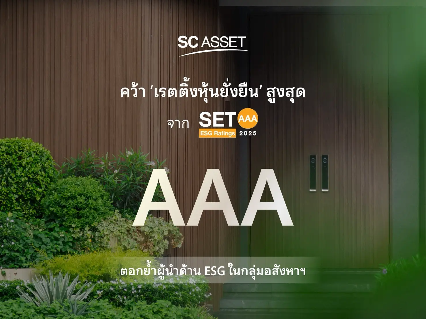 SC Asset คว้าเรตติ้งหุ้นยั่งยืน SET ESG Ratings 2025 ระดับสูงสุด “AAA” ตอกย้ำผู้นำอสังหาริมทรัพย์ไทย ขับเคลื่อนธุรกิจควบคู่การดูแลสิ่งแวดล้อมและสังคม