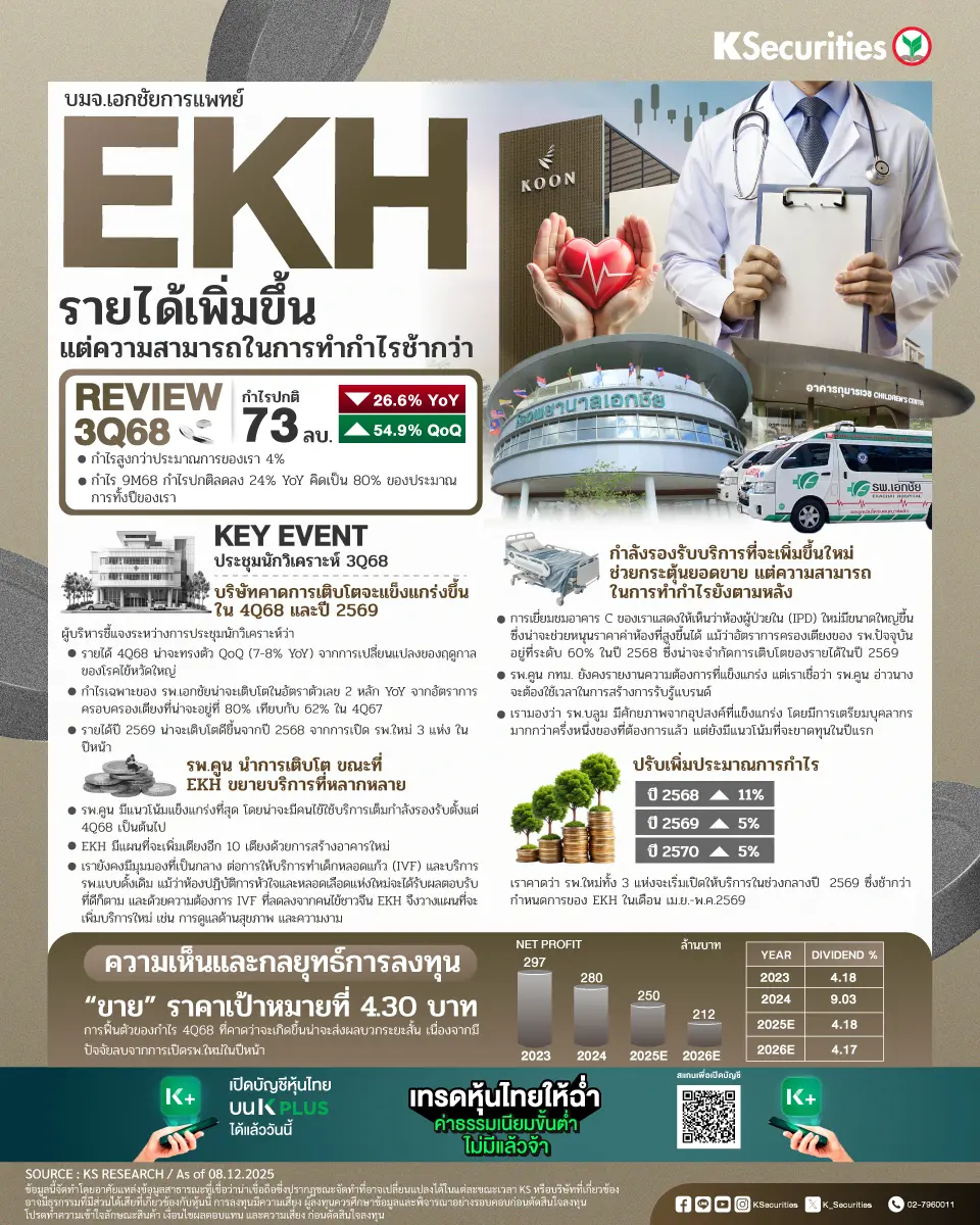 ผู้บริหารชี้แจงระหว่างการประชุมนักวิเคราะห์ประจำไตรมาส 3/2568 ในสัปดาห์ที่แล้วว่ารายได้ไตรมาส 4/2568 น่าจะทรงตัว QoQ (7-8% YoY) จากการเปลี่ยนแปลงของฤดูกาลของโรคไข้หวัดใหญ่ ขณะที่กำไรเฉพาะของ รพ.เอกชัยน่าจะเติบโตในอัตราตัวเลข 2 หลัก YoY จากอัตราการครอบครองเตียงที่น่าจะอยู่ที่ 80% เทียบกับ 62% ในไตรมาส 4/2567 และรายได้ปี 2569 น่าจะเติบโตดีขึ้นจากปี 2568 จากการเปิด รพ.ใหม่ 3 แห่ง ในปีหน้า