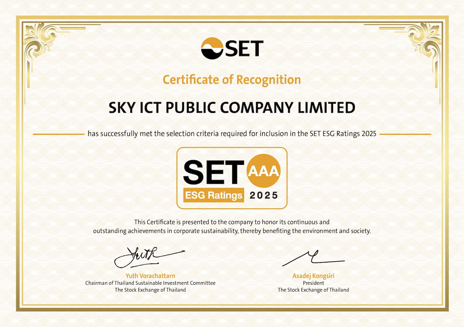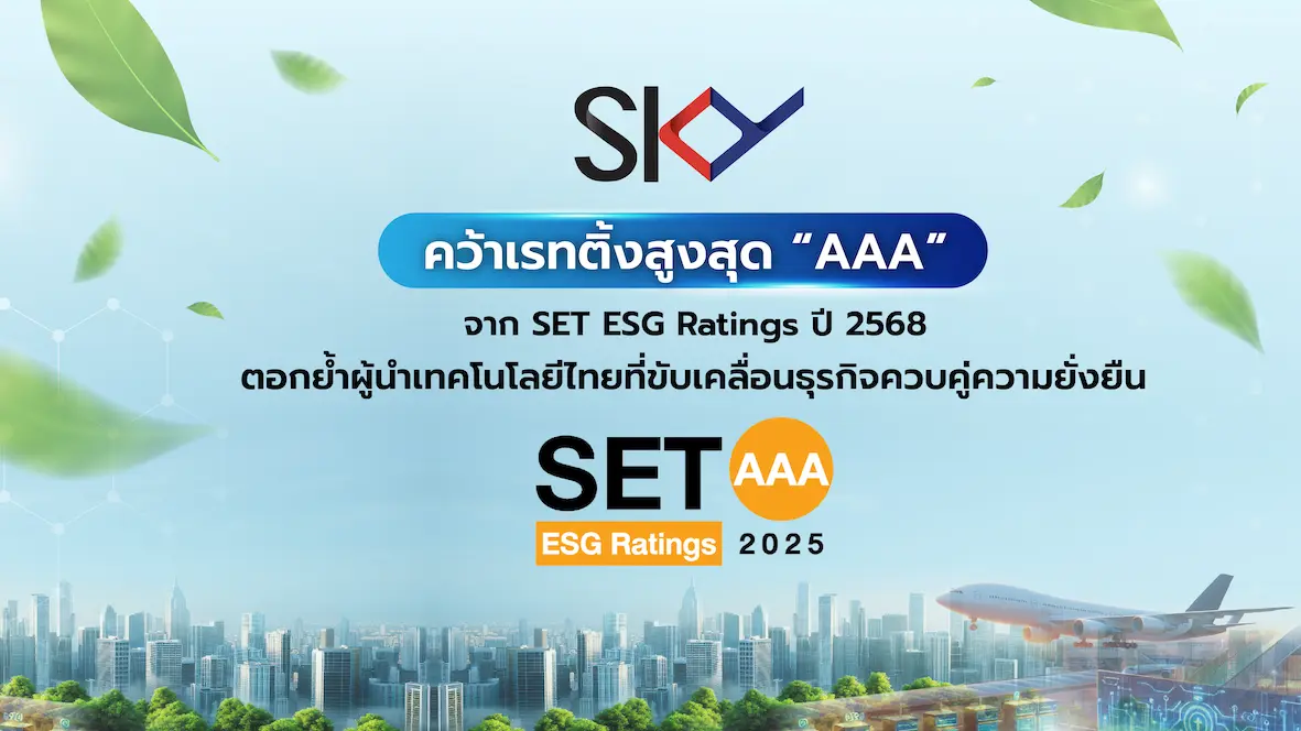 บริษัท สกาย ไอซีที จำกัด (มหาชน) หรือ SKY ICT ตอกย้ำสถานะผู้นำด้านเทคโนโลยีดิจิทัลของประเทศไทย หลังได้รับการจัดอันดับ SET ESG Ratings 2025 ในระดับสูงสุด “AAA” จากตลาดหลักทรัพย์แห่งประเทศไทย (SET) สะท้อนความเป็นเลิศในการดำเนินธุรกิจภายใต้กรอบ Environmental, Social และ Governance (ESG) อย่างเป็นระบบ โปร่งใส และยั่งยืน สร้างความเชื่อมั่นให้แก่นักลงทุน สถาบันการเงิน และกองทุนที่ให้ความสำคัญกับการลงทุนระยะยาว การได้รับเรทติ้ง “AAA” ซึ่งเป็นระดับสูงสุดของ SET ESG Ratings ในปี 2568 ถือเป็นเครื่องยืนยันว่า SKY ICT ไม่เพียงเติบโตจากผลประกอบการและศักยภาพทางธุรกิจเท่านั้น แต่ยังสามารถผสาน กลยุทธ์เทคโนโลยี เข้ากับ ความรับผิดชอบต่อสังคม สิ่งแวดล้อม และธรรมาภิบาล ได้อย่างสมดุลในทุกมิติขององค์กร