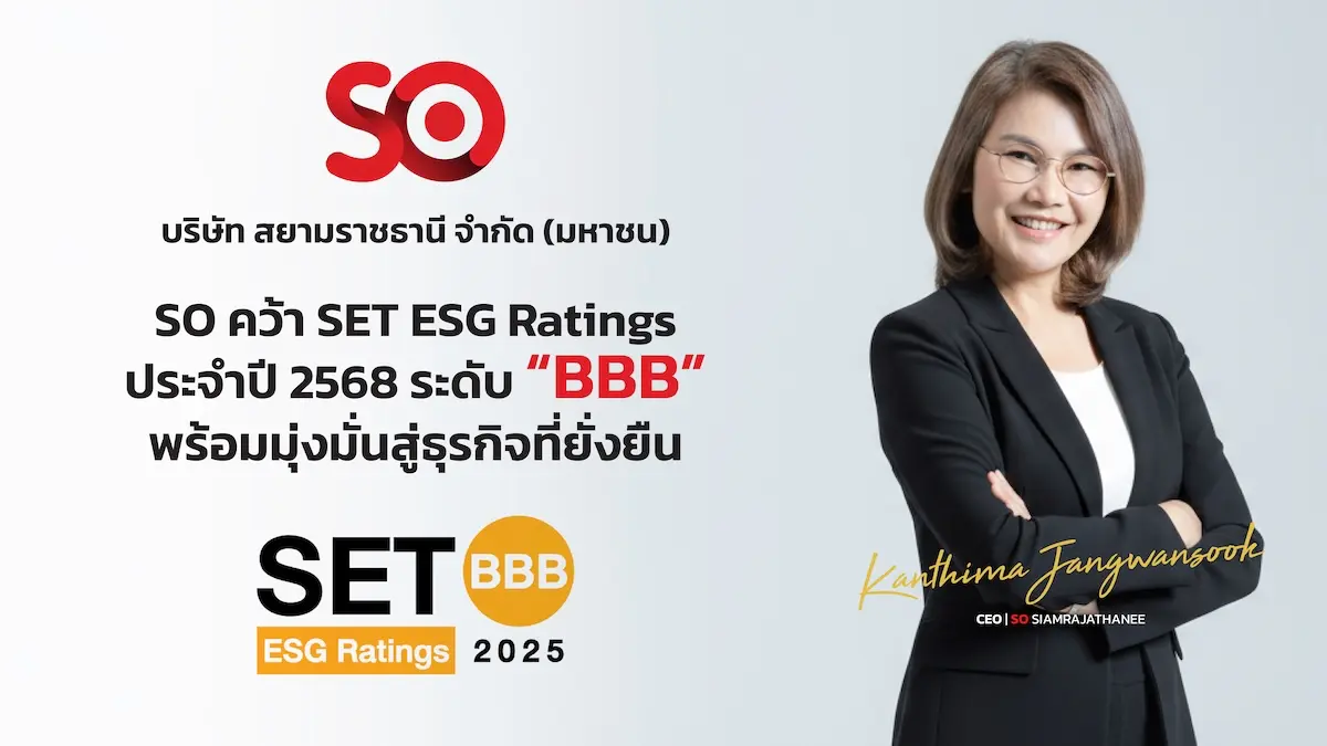 คุณกัณธิมา แจ้งวันสุข ประธานเจ้าหน้าที่บริหาร บริษัท สยามราชธานี จำกัด (มหาชน) หรือ SO เปิดเผยว่าบริษัทได้รับการจัดอันดับหุ้นยั่งยืน SET ESG Ratings ปี 2568 ระดับ “BBB” ในกลุ่มบริการ จากตลาดหลักทรัพย์แห่งประเทศไทย สะท้อนความสำเร็จในการดำเนินธุรกิจตามแนวปฏิบัติด้านความยั่งยืน โดย SO ดำเนินธุรกิจหลัก 2 รูปแบบ ได้แก่ ธุรกิจบริการเอาท์ซอร์ส และธุรกิจบริการด้านเทคโนโลยี เพื่อสนับสนุนการ Transformation ขององค์กรลูกค้า พร้อมบูรณาการหลักการ ESG เข้ากับกลยุทธ์องค์กรอย่างเป็นรูปธรรม ผ่านการบริหารจัดการทรัพยากรอย่างมีประสิทธิภาพ การลดผลกระทบต่อสิ่งแวดล้อม และการนำเทคโนโลยีดิจิทัลมาเพิ่มศักยภาพการให้บริการ