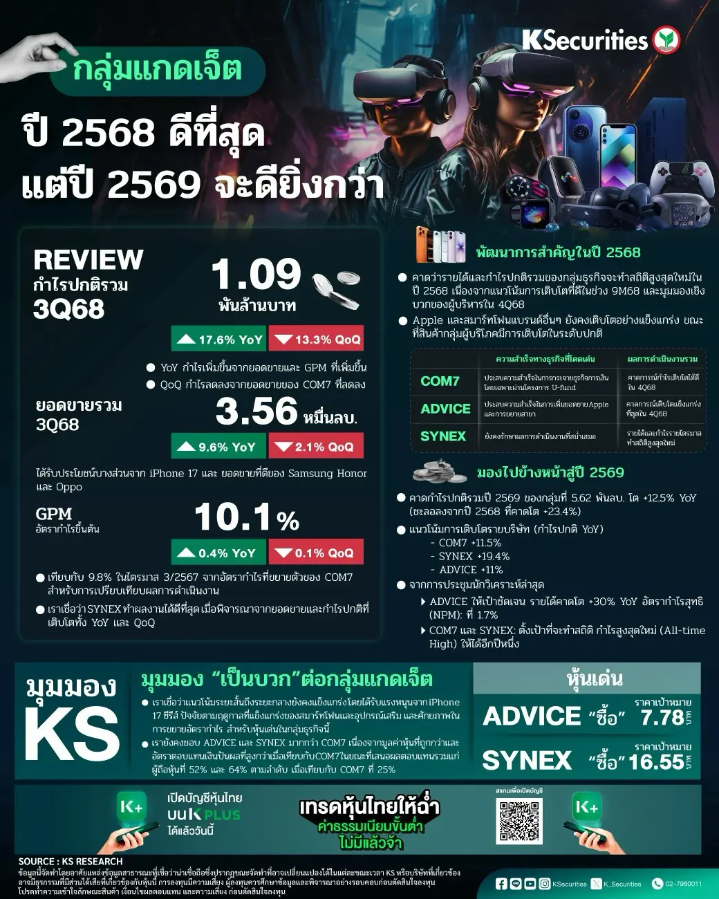 - พัฒนาการสำคัญในปี 2568 จากแนวโน้มการเติบโตที่เพิ่มขึ้นในช่วง 9 เดือนแรกของปี 2568 ประกอบกับแนวทางธุรกิจเชิงบวกของผู้บริหารในไตรมาส 4/2568 เราเชื่อว่ารายได้และกำไรปกติรวมของกลุ่มธุรกิจนี้จะทำสถิติสูงสุดใหม่ในปีนี้ เราคาดว่า ADVICE จะรายงานการเติบโตที่แข็งแกร่งที่สุดทั้ง YoY และ QoQ ในไตรมาส 4/2568 เมื่อเทียบกับ COM7 และ SYNEX โดยได้รับแรงหนุนจากยอดขายผลิตภัณฑ์ Apple ที่เพิ่มขึ้นจากการขยายสาขา iStore สำหรับภาพรวมในปี 2568 เราพบว่ายอดขายในกลุ่มสื่อสาร โดยเฉพาะ Apple และสมาร์ทโฟนแบรนด์อื่นๆ ยังคงเติบโตอย่างแข็งแกร่ง ขณะที่กลุ่มผู้บริโภคมีการเติบโตในระดับปกติ สำหรับการพัฒนาธุรกิจรายบริษัท COM7 ประสบความสำเร็จในการกระจายธุรกิจการเงิน โดยเฉพาะผ่านโครงการ U-fund ขณะที่ ADVICE ประสบความสำเร็จในการเพิ่มยอดขาย Apple และ SYNEX ยังคงรักษาผลการดำเนินงานที่สม่ำเสมอ โดยรายได้และกำไรรายไตรมาสทำสถิติสูงสุดใหม่