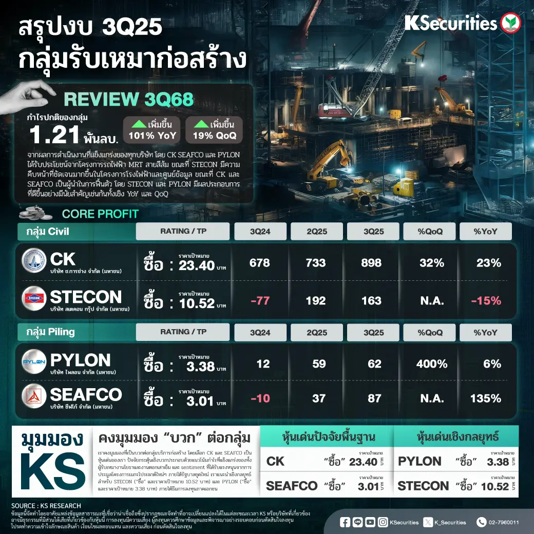 - กำไรปกติรวมไตรมาส 3/68 อยู่ที่ 1.21 พันลบ. (+101% YoY และ +19% QoQ) โดยได้รับแรงหนุนจากผลงานที่แข็งแกร่งของบริษัทรับเหมาทุกรายที่เราวิเคราะห์อยู่