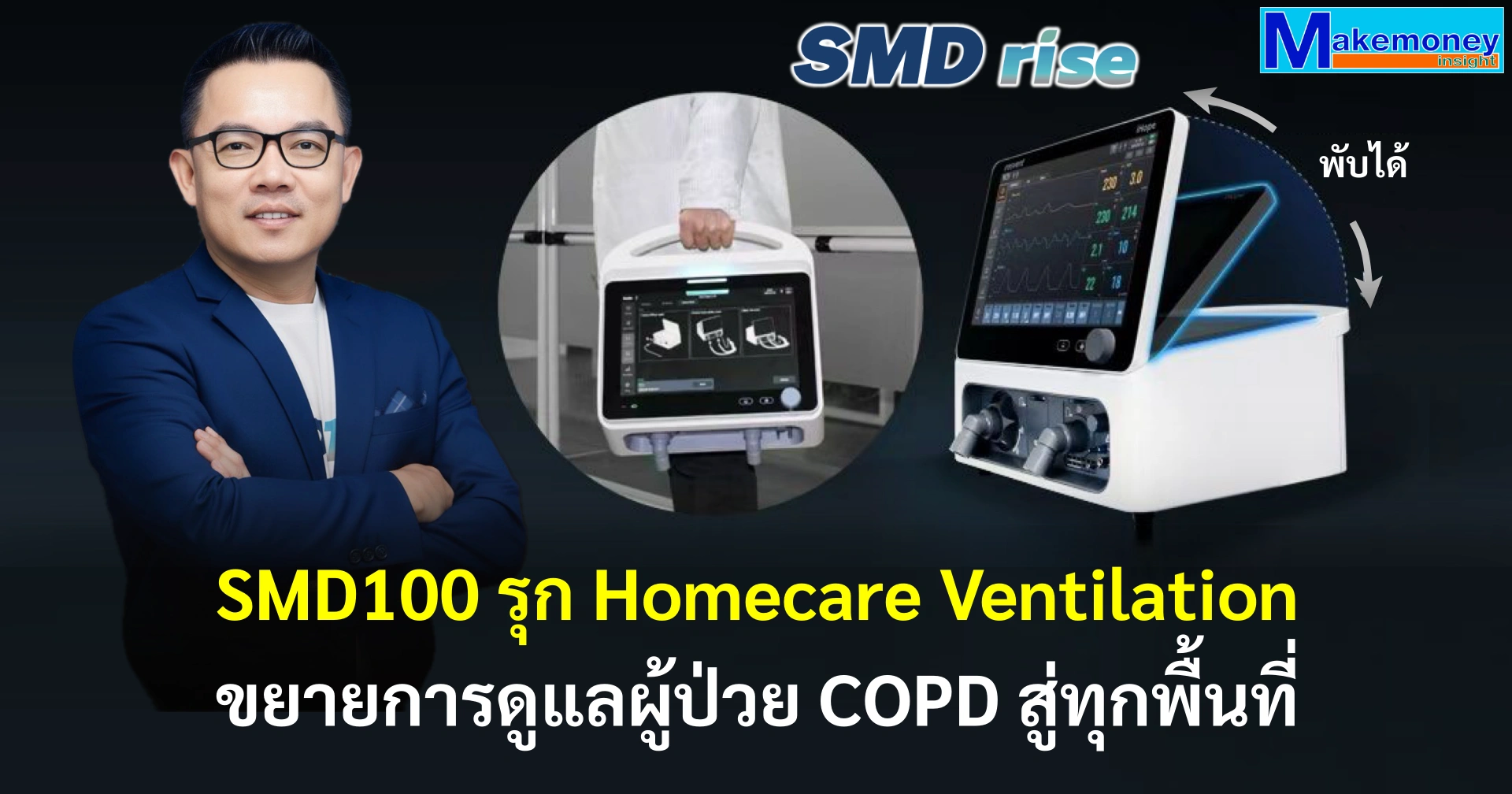 ดร. วิโรจน์ วสุศุทธิกุลกานต์ ประธานเจ้าหน้าที่บริหาร (CEO & Chief Health Policy Architect) บริษัท เอสเอ็มดี ไรส์ จำกัด (มหาชน) หรือ SMD100 เปิดเผยว่า บริษัทฯ เดินหน้ารุกตลาด Homecare Ventilation อย่างเป็นระบบ เพื่อตอบโจทย์ผู้ป่วยโรคปอดอุดกั้นเรื้อรัง (COPD) ที่ยังต้องการการช่วยหายใจอย่างต่อเนื่อง โดยเฉพาะในระยะหลังพ้นภาวะกำเริบ หรือหลังออกจาก ICU แต่ไม่จำเป็นต้องนอนโรงพยาบาลระยะยาว โซลูชันนี้ถูกออกแบบมาเพื่อการดูแลต่อเนื่องของผู้ป่วย COPD จากโรงพยาบาลสู่บ้านผู้ป่วย ภายใต้การกำกับและการตัดสินใจทางคลินิกของอายุรแพทย์ระบบทางเดินหายใจ