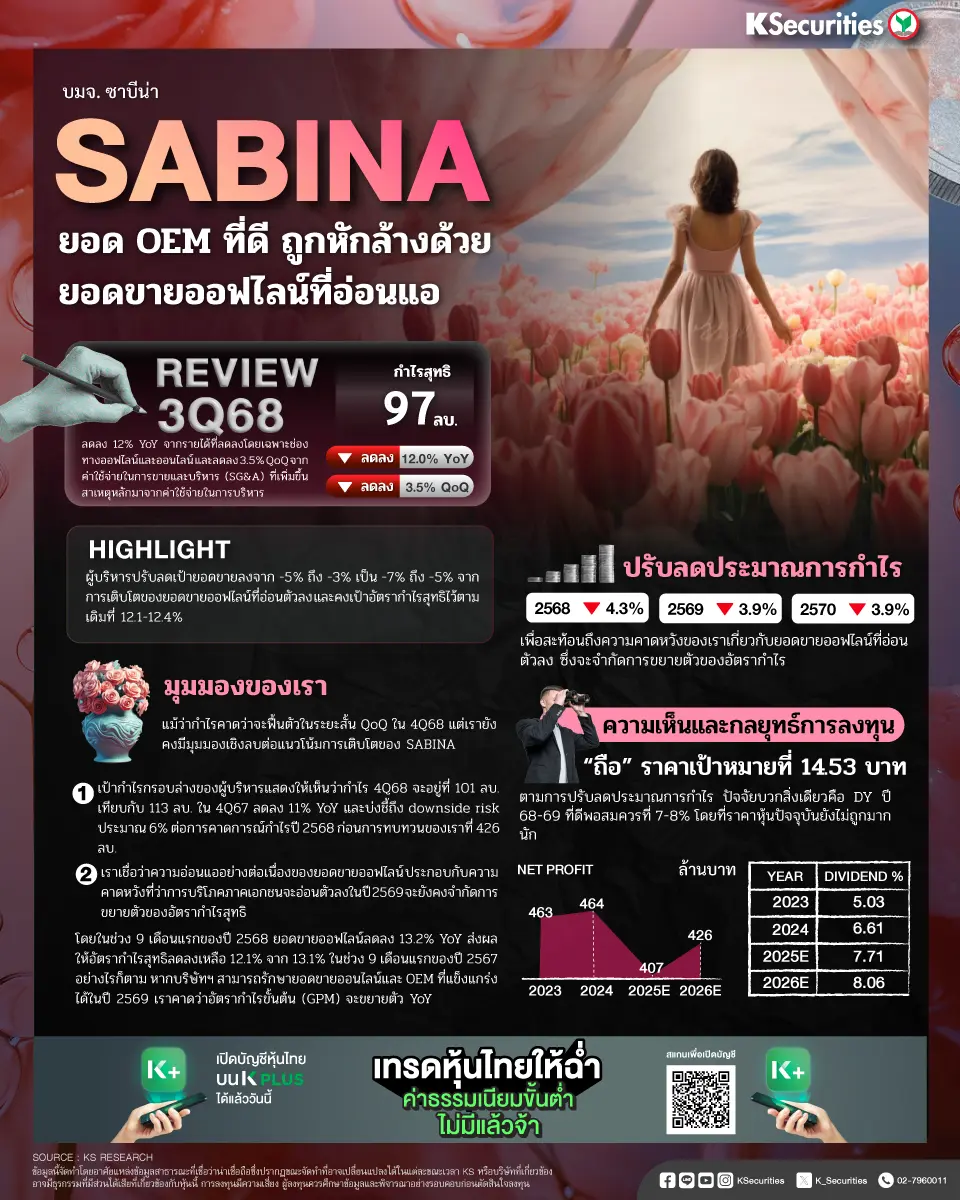 - แม้ว่ากำไรคาดว่าจะฟื้นตัวในระยะสั้น QoQ ในไตรมาส 4/2568 แต่เรายังคงมีมุมมองเชิงลบต่อแนวโน้มการเติบโตของ SABINA ประการแรก เป้ากำไรกรอบล่างของผู้บริหารแสดงให้เห็นว่ากำไรไตรมาส 4/2568 จะอยู่ที่ 101 ลบ. เทียบกับ 113 ลบ. ในไตรมาส 4/2567 ลดลง 11% YoY และบ่งชี้ถึง downside risk ประมาณ 6% ต่อการคาดการณ์กำไรปี 2568 ก่อนการทบทวนของเราที่ 426 ลบ. ประการที่สอง เราเชื่อว่าความอ่อนแออย่างต่อเนื่องของยอดขายออฟไลน์ ประกอบกับความคาดหวังที่ว่าการบริโภคภาคเอกชนจะอ่อนตัวลงในปี 2569 จะยังคงจำกัดการขยายตัวของอัตรากำไรสุทธิ โดยในช่วง 9 เดือนแรกของปี 2568 ยอดขายออฟไลน์ลดลง 13.2% YoY ส่งผลให้อัตรากำไรสุทธิลดลงเหลือ 12.1% จาก 13.1% ในช่วง 9 เดือนแรกของปี 2567 อย่างไรก็ตาม หากบริษัทฯ สามารถรักษายอดขายออนไลน์และ OEM ที่แข็งแกร่งได้ในปี 2569 เราคาดว่าอัตรากำไรขั้นต้น (GPM) จะขยายตัว YoY