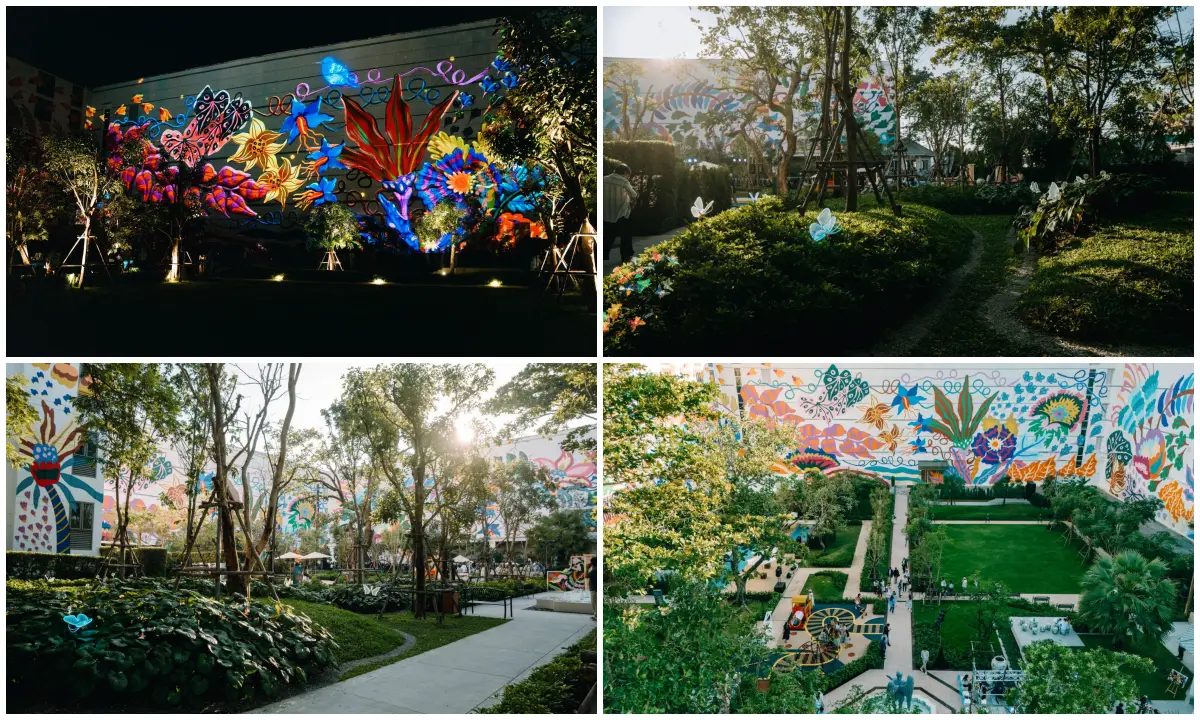 1) กำแพงพฤกษา “The Wall” ผลงานของ นุ่น นววรรณ โตวิเศษ กับศิลปะภาพวาดบนฝาผนัง Mural Art ขนาดกว่า 3,000 ตารางเมตร ถ่ายทอดความงามของพรรณไม้เลื้อยและระบบนิเวศแห่งจินตนาการราวกับมีชีวิต ลวดลายพืชพันธุ์ที่พลิ้วไหวดั่งกำลังเต้นตามสายลม นำเสนอสีสันอันสดใสที่ช่วยปลุกพลังบวกและสร้างสุนทรียะใหม่ให้กับสถาปัตยกรรมและพื้นที่สวน นับเป็นอีกหนึ่งองค์ประกอบที่ทำให้พื้นที่แห่งนี้โดดเด่นและมีเอกลักษณ์เฉพาะตัว
