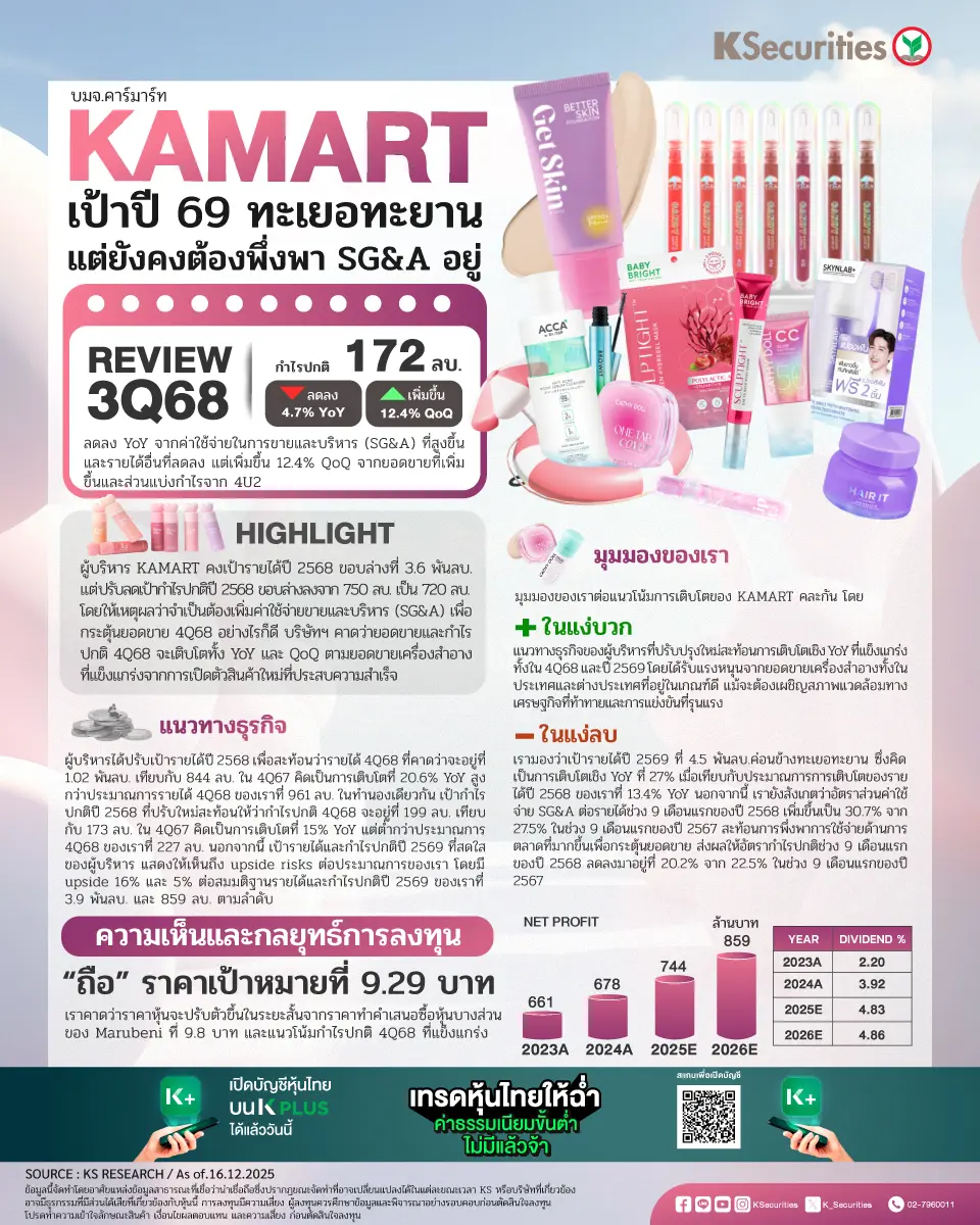 - แนะ “ถือ” KAMART และราคาเป้าหมายสิ้นปี 2569 ที่ 9.29 บาท เราคาดว่าราคาหุ้นจะปรับตัวขึ้นในระยะสั้น จากราคาทำคำเสนอซื้อหุ้นบางส่วนของ Marubeni ที่ 9.8 บาท (สูงกว่าราคาตลาดล่าสุด 9%) โดยขึ้นอยู่กับการอนุมัติในวันที่ 5 ม.ค. รวมถึงการคาดการณ์ที่ว่ากำไรปกติไตรมาส 4/2568 จะเติบโตทั้ง YoY และ QoQ