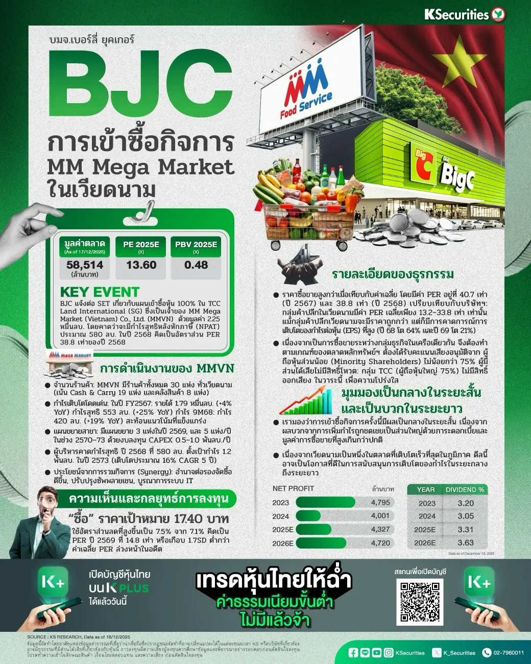 - BJC ได้แจ้งต่อตลาดหลักทรัพย์แห่งประเทศไทยเกี่ยวกับการเข้าซื้อกิจการ TCC Land International (SG) ซึ่งเป็นเจ้าของบริษัท MM Mega Market (Vietnam) Co., Ltd. (MMVN) ด้วยมูลค่ารวม 2.25 หมื่นลบ. การทำธุรกรรมครั้งนี้จะใช้แหล่งเงินทุนจากการกู้ยืมทั้งหมด ซึ่งมีต้นทุนทางการเงินโดยประมาณที่ 2.6% สำหรับระยะกลาง และประมาณ 2.25% สำหรับช่วง 14 เดือนแรก ซึ่งคิดเป็นค่าใช้จ่ายทางการเงินประมาณ 500-600 ลบ. จากการคาดการณ์ของเรา การเข้าซื้อกิจการครั้งนี้คาดว่าจะช่วยเพิ่มกำไรได้ประมาณ 2–4% ในปี 2569 และอัตราส่วนหนี้สินสุทธิต่อส่วนของผู้ถือหุ้น (Net D/E ratio) คาดว่าจะเพิ่มขึ้นเป็น 1.3 เท่า จาก 1.1 เท่า ณ สิ้นปี 2568