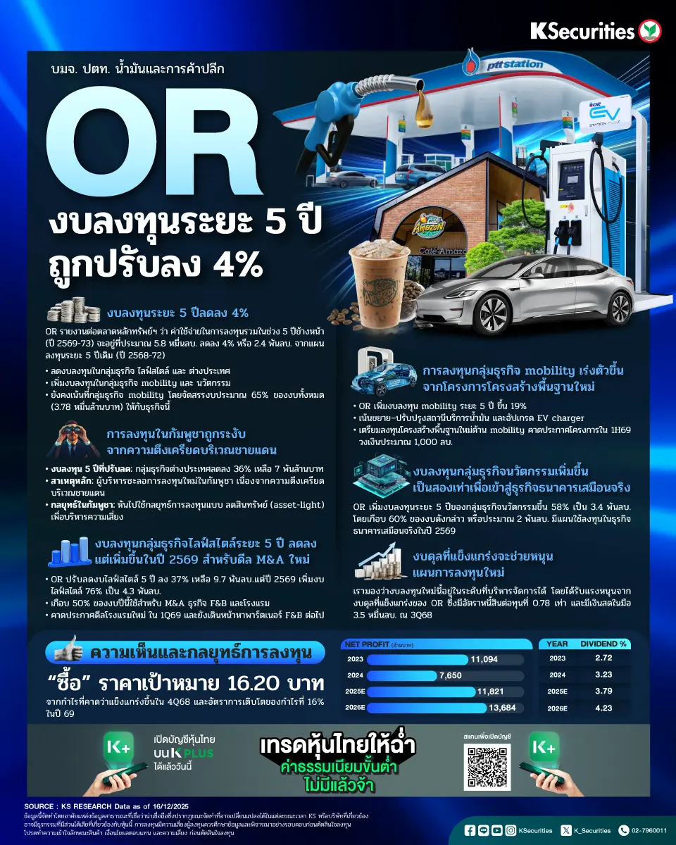 - OR รายงานต่อตลาดหลักทรัพย์ฯ ว่า ค่าใช้จ่ายในการลงทุนรวมในช่วง 5 ปีข้างหน้า (ปี 2569-73) จะอยู่ที่ประมาณ 5.8 หมื่นลบ. ลดลง 4% หรือ 2.4 พันลบ. จากแผนลงทุนระยะ 5 ปีเดิม (ปี 2568-72) โดยแผนการใช้จ่ายที่ลดลง มีสาเหตุหลักมาจากงบลงทุนที่ลดลงในกลุ่มธุรกิจไลฟ์สไตล์ และกลุ่มธุรกิจต่างประเทศ แต่ถูกชดเชยบางส่วนด้วยการลงทุนในกลุ่มธุรกิจ mobility และกลุ่มธุรกิจนวัตกรรมที่เพิ่มขึ้น ทั้งนี้ แผนการลงทุนใหม่ยังคงเน้นไปที่กลุ่มธุรกิจ mobility เป็นหลัก โดยจัดสรรงบการลงทุนประมาณ 65% ของงบทั้งหมด หรือ 3.78 หมื่นลบ. ให้กับธุรกิจดังกล่าว
