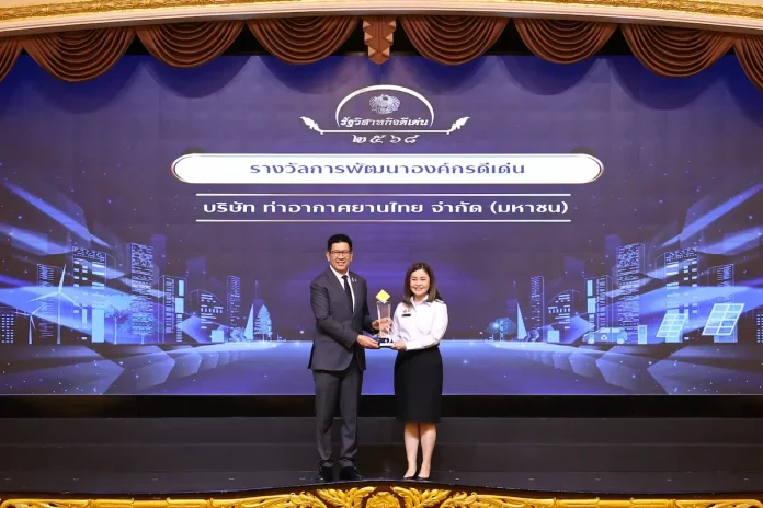 นางสาวปวีณา จริยฐิติพงศ์ รักษาการผู้อำนวยการใหญ่ บริษัท ท่าอากาศยานไทย จำกัด (มหาชน) (AOT) เข้ารับรางวัลรัฐวิสาหกิจดีเด่น ประจำปี 2568 ประเภทรางวัลการพัฒนาองค์กรดีเด่น ในฐานะหน่วยงานรัฐวิสาหกิจที่มีความมุ่งมั่นในการพัฒนาและปรับสถานะองค์กรให้ดีขึ้นอย่างต่อเนื่อง เพื่อให้สามารถตอบสนองต่อพันธกิจที่ได้รับมอบหมายอย่างมีประสิทธิภาพสูงสุด จากนายเอกนิติ นิติทัณฑ์ประภาศ รองนายกรัฐมนตรีและรัฐมนตรีว่าการกระทรวงการคลัง ณ ตึกสันติไมตรี ทำเนียบรัฐบาล โดยงานดังกล่าวจัดขึ้นโดยสำนักงานคณะกรรมการนโยบายรัฐวิสาหกิจ มีวัตถุประสงค์เพื่อเป็นการสร้างขวัญและกำลังใจในการปฏิบัติงานของหน่วยงานรัฐวิสาหกิจ รวมทั้งส่งเสริมให้หน่วยงานรัฐวิสาหกิจมีความมุ่งมั่นในการดำเนินงานเพื่อพัฒนาองค์กรให้มีประสิทธิภาพและนำองค์กรสู่ความเป็นเลิศ ภายใต้แนวคิด “รัฐวิสาหกิจขับเคลื่อนสังคมไทย มุ่งผลลัพธ์สู่ความยั่งยืน Driving Society, Delivering Sustainability”