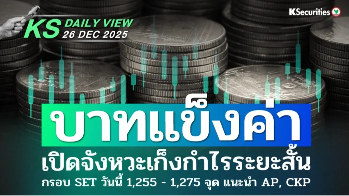 KS Daily View 26 ธ.ค. 2025>>> ประเมินกรอบ SET index ที่ 1,255-1,275 จุด คาดว่า SET index มองภาพระยะสั้นยังคงเป็น sideways เข้าสู่ช่วงของเทศกาลวันหยุดยาว แต่อาจเห็นแรงเก็งกำไรหุ้นที่ได้ประโยชน์ของค่าเงินบาทที่แข็งค่าขึ้น แนะนำ AP และ CKP