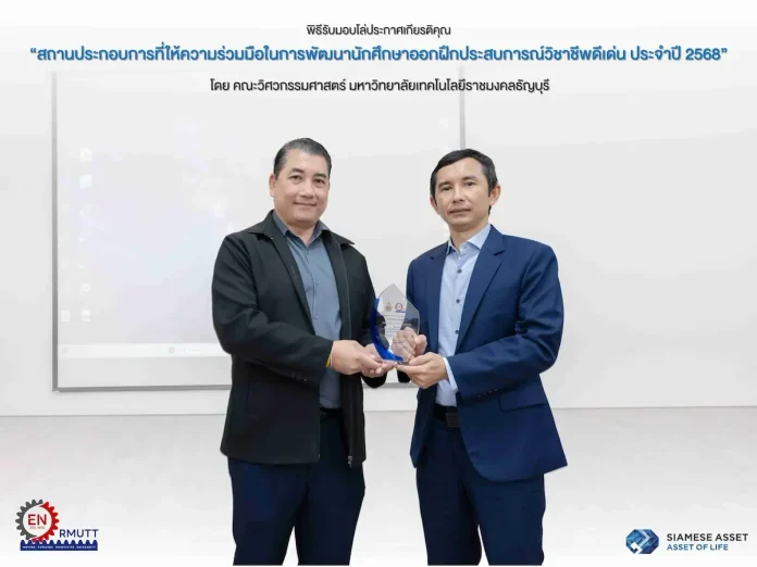 คุณมณเฑียร ยิ่งดำนุ่น (ขวา) ประธานเจ้าหน้าที่ฝ่ายปฏิบัติการร่วม (co-COO) บริษัท ไซมิส แอสเสท จำกัด (มหาชน) (SA) ถ่ายภาพร่วมกับ รศ.ดร.ศิริชัย แดงเอม (ซ้าย) รองคณบดี ฝ่ายวิชาการ คณะวิศวกรรมศาสตร์ มหาวิทยาลัยเทคโนโลยีราชมงคลธัญบุรี เนื่องในโอกาสที่เป็นผู้แทนบริษัทรับมอบโล่ประกาศเกียรติคุณ “สถานประกอบการที่ให้ความร่วมมือในการพัฒนานักศึกษาออกฝึกประสบการณ์วิชาชีพดีเด่น ประจำปี 2568” ซึ่งรางวัลดังกล่าวสะท้อนถึงความมุ่งมั่นในการสนับสนุนการพัฒนาศักยภาพเยาวชนไทย โดยเปิดโอกาสให้นักศึกษาด้านวิศวกรรมและสาขาที่เกี่ยวข้องได้เข้าร่วมฝึกประสบการณ์วิชาชีพภายในองค์กร เพื่อเรียนรู้จากการทำงานจริง และต่อยอดความรู้สู่การพัฒนาอาชีพในอนาคต