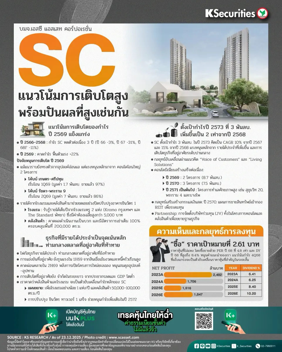 - แนะนำ “ซื้อ” TP 2.61 บาท นอกจากราคาหุ้นที่ไม่แพงแล้ว โดยซื้อขายด้วย PER ปี 2568 ที่เพียง 4.7 เท่า ราคาปิดล่าสุดยังเสนออัตราตอบแทนเงินปันผล (DY) ปี 2568 ที่ดีถึง 8.5% นอกจากการฟื้นตัวของกำไรที่แข็งแกร่งในปี 2569 เรามองว่าแนวโน้มการเติบโตที่สูงของธุรกิจที่มีรายได้ประจำจะช่วยให้ SC สามารถสร้างการเติบโตของกำไรในอัตราตัวเลข 2 หลักในอีกหลายปีข้างหน้า ซึ่งจะสร้างความโดดเด่นเหนือคู่แข่งหลายบริษัทในกลุ่มธุรกิจเดียวกัน ราคาหุ้นมีโอกาสที่ดีในการปรับตัวสูงขึ้น เมื่อนักลงทุนเชื่อมั่นในแนวโน้มการเติบโตที่ดีในปี 2569 ทั้งนี้การเติบโตของกำไรไตรมาส 4/2568 ทั้ง YoY และ QoQ จะเป็นปัจจัยกระตุ้นราคาหุ้นที่สำคัญในระยะสั้น