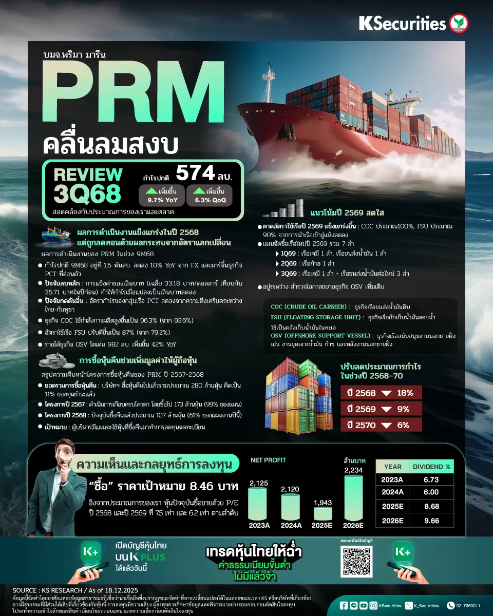- บริษัทฯ รายงานผลการดำเนินงานที่แข็งแกร่งในช่วง 9M68 แต่ผลประกอบการได้รับผลกระทบบางส่วนจากผลกระทบของอัตราแลกเปลี่ยน เนื่องจากอัตราแลกเปลี่ยนเฉลี่ยในสกุลบาทต่อดอลลาร์สหรัฐฯ ในช่วง 9M68 อยู่ที่ 33.18 บาท เมื่อเทียบกับ 35.71 บาทในช่วง 9M67 PRM รายงานกำไรปกติช่วง 9M68 ที่ 1.5 พันลบ. ซึ่งลดลง 10% YoY โดยมีสาเหตุหลักมาจากการแข็งค่าของเงินบาทเมื่อเทียบกับดอลลาร์สหรัฐฯ และอัตรากำไรจากการดำเนินงานที่ลดลงในธุรกิจเรือขนส่งน้ำมันและสารเคมี (PCT) ซึ่งส่วนหนึ่งได้รับแรงกดดันจากความตึงเครียดระหว่างประเทศไทยและกัมพูชา