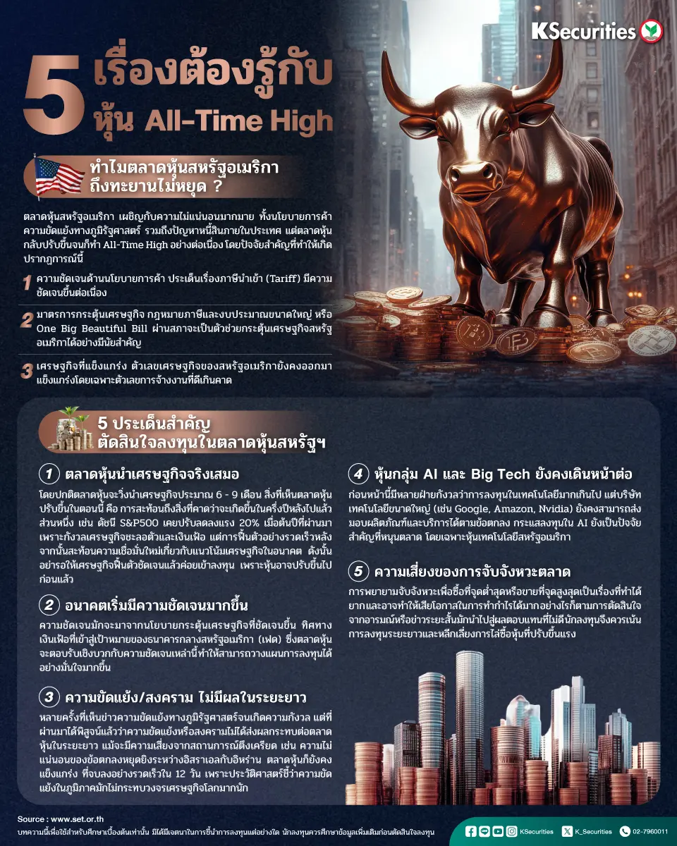 ตลาดหุ้นสหรัฐอเมริกา เผชิญกับความไม่แน่นอนมากมาย ทั้งนโยบายการค้า ความขัดแย้งทางภูมิรัฐศาสตร์ รวมถึงปัญหาหนี้สินภายในประเทศ แต่ตลาดหุ้นกลับปรับขึ้นจนก็ทำ All-Time High อย่างต่อเนื่อง โดยปัจจัยสำคัญที่ทำให้เกิดปรากฏการณ์นี้