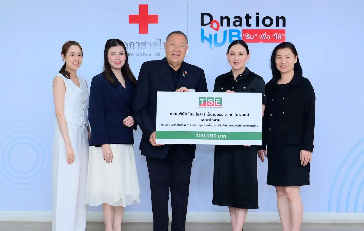 ดร.แคทลีน มาลีนนท์ (ที่ 2 จากขวา) ประธานเจ้าหน้าที่บริหาร บริษัท ไทย โซล่าร์ เอ็นเนอร์ยี่ จำกัด (มหาชน) (TSE) พร้อมด้วยคณะผู้บริหารและพนักงาน ร่วมมอบเงินบริจาคจำนวน 100,000 บาท ให้แก่สภากาชาดไทย ในโครงการเงินทุนฉุกเฉินเพื่อช่วยเหลือผู้ประสบภัยพิบัติ เพื่อสนับสนุนการช่วยเหลือผู้ประสบภัยพิบัติต่างๆ ได้อย่างทันท่วงที ลดความสูญเสียทั้งในด้านชีวิตและทรัพย์สิน รวมถึงการเยียวยาและฟื้นฟูพื้นที่หลังเกิดเหตุภัยพิบัติ ทั้งนี้ TSE มุ่งมั่นที่จะยืนเคียงข้างสังคมไทยก้าวผ่านทุกวิกฤตไปด้วยกัน กิจกรรมดังกล่าวจัดขึ้น ณ สภากาชาดไทย เมื่อเร็วๆ นี้