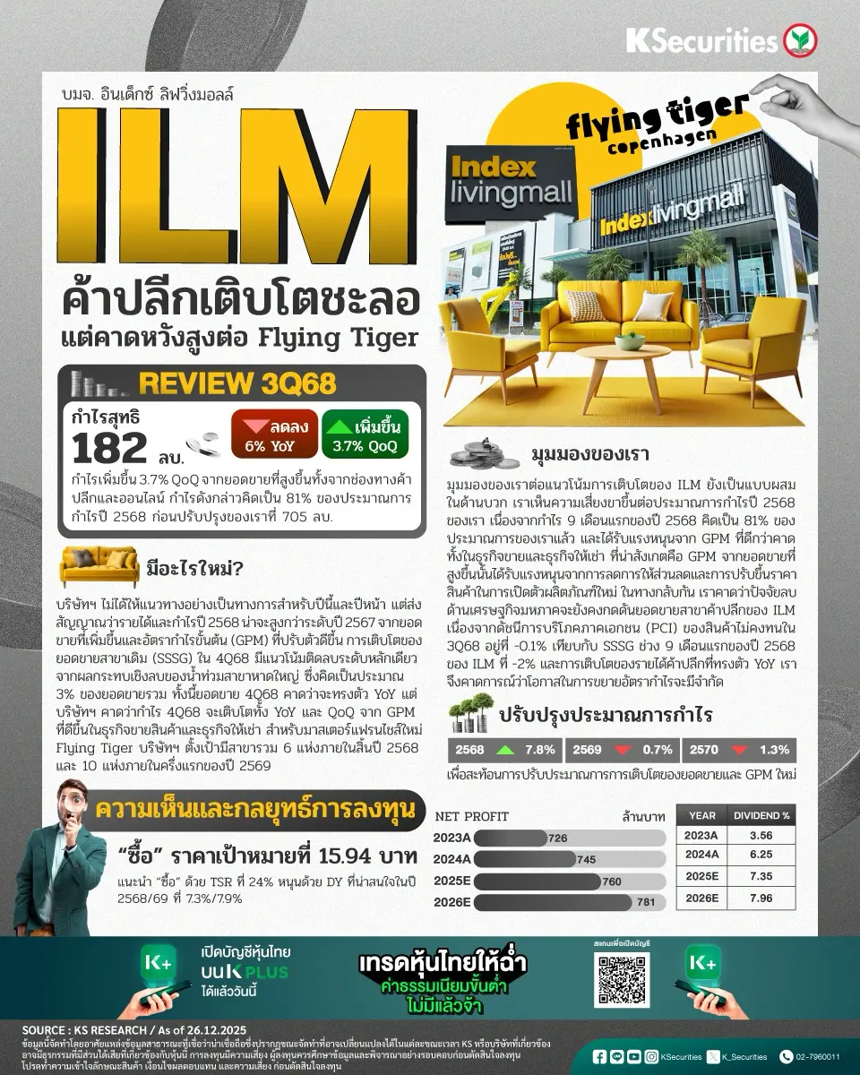 - ในทางกลับกัน เราคาดว่าปัจจัยลบด้านเศรษฐกิจมหภาคจะยังคงกดดันยอดขายสาขาค้าปลีกของ ILM เนื่องจากดัชนีการบริโภคภาคเอกชน (PCI) ของสินค้าไม่คงทนในไตรมาส 3/2568 อยู่ที่ -0.1% เทียบกับ SSSG ช่วง 9 เดือนแรกของปี 2568 ของ ILM ที่ -2% และการเติบโตของรายได้ค้าปลีกที่ทรงตัว YoY เราจึงคาดการณ์ว่าโอกาสในการขยายอัตรากำไรจะมีจำกัด