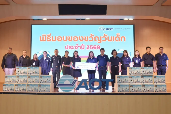นางสาวปวีณา จริยฐิติพงศ์ รักษาการผู้อำนวยการใหญ่ บริษัท ท่าอากาศยานไทย จำกัด (มหาชน) (AOT) เป็นประธานในพิธี “AOT มอบของขวัญวันเด็ก ประจำปี 2569” โดยมี ผู้บริหารระดับสูง ร่วมมอบของขวัญกระเป๋าชุดเครื่องเขียน ประกอบด้วย สมุด ดินสอ ยางลบ ไม้บรรทัด สำหรับใช้ในการศึกษาให้แก่หน่วยงานภาครัฐ โรงเรียน รวมทั้งชุมชนมากกว่า 280 แห่ง เพื่อนำไปมอบให้กับเด็กๆ เนื่องในโอกาสวันเด็กแห่งชาติ เมื่อวันที่ 7 มกราคม 2569 ณ ห้อง Auditorium อาคารสำนักงานใหญ่ AOT
