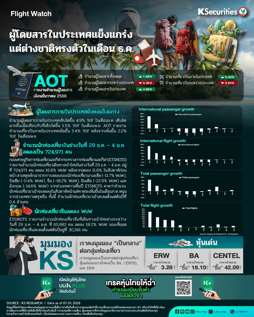 - จำนวนผู้โดยสารภายในประเทศเติบโตขึ้น 4.9% YoY ในเดือนธ.ค. เติบโตมากขึ้นเมื่อเทียบกับที่เติบโตขึ้น 1.5% YoY ในเดือนพ.ย. AOT รายงานจำนวนเที่ยวบินภายในประเทศเพิ่มขึ้น 5.4% YoY หลังจากเพิ่มขึ้น 2.2% YoY ในเดือนพ.ย.