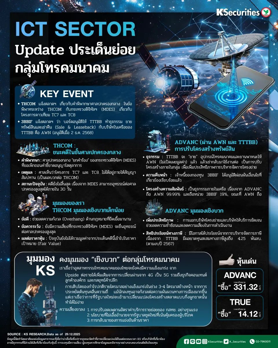 • สำหรับ THCOM เรามีมุมมองเชิงบวกเล็กน้อยต่อความคืบหน้าด้านกฎหมายดังกล่าว เนื่องจากช่วยผ่อนคลายปัจจัยกดดันด้านกฎหมายที่ค้างอยู่ อย่างไรก็ดี เราไม่ได้รวมประเด็นคดีนี้ไว้ในประมาณการทางการเงินและมูลค่ายุติธรรมของ THCOM และมีความเป็นไปได้ที่ MDES จะยื่นอุทธรณ์คดีต่อศาลชั้นสูง สำหรับ ADVANC เรามีมุมมองเชิงบวกต่อการปรับโครงสร้างภายในครั้งนี้ ประการแรก การแยกบทบาทของบริษัทโครงข่ายและบริษัทให้บริการอย่างชัดเจน จะช่วยลดความซ้ำซ้อนและลดความเสี่ยงด้านการดำเนินงาน ประการที่สอง เรายังไม่ตัดความเป็นไปได้ของประโยชน์จากการบริหารจัดการภาษี จากหมายเหตุประกอบงบการเงินของ ADVANC ในปี 2567 ระบุว่า TTTBB มีผลขาดทุนทางภาษีที่ยกยอดมาในบัญชีจำนวน 4.25 พันลบ.