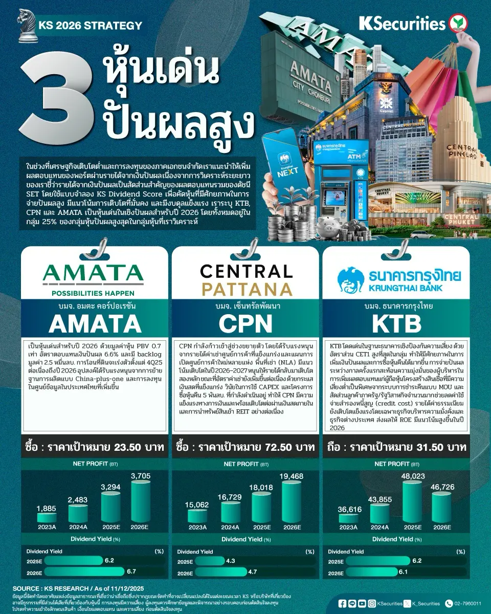 ในช่วงที่เศรษฐกิจเติบโตต่ำและการลงทุนของภาคเอกชนจำกัด เราแนะนำให้เพิ่มผลตอบแทนของพอร์ตผ่านรายได้จากเงินปันผล เนื่องจากการวิเคราะห์ระยะยาวของเราชี้ว่ารายได้จากเงินปันผลเป็นสัดส่วนสำคัญของผลตอบแทนรวมของดัชนี SET โดยใช้แบบจำลอง KS Dividend Score เพื่อคัดหุ้นที่มีศักยภาพในการจ่ายปันผลสูง มีแนวโน้มการเติบโตที่มั่นคง และมีงบดุลแข็งแรง เราระบุ KTB, CPN และ AMATA เป็นหุ้นเด่นในเชิงปันผลสำหรับปี 2026 โดยทั้งหมดอยู่ในกลุ่ม 25% ของกลุ่มหุ้นปันผลสูงสุดในกลุ่มหุ้นที่เราวิเคราะห์