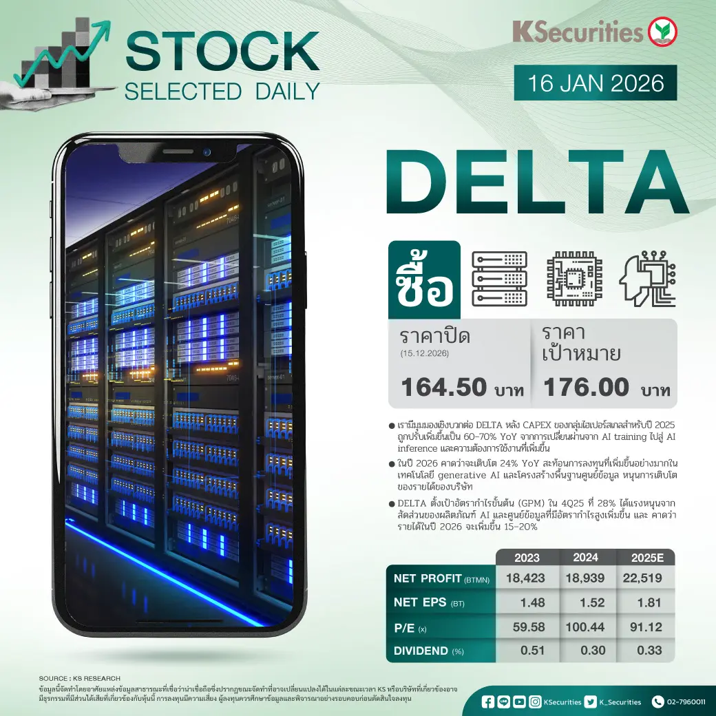 - DELTA ตั้งเป้าอัตรากำไรขั้นต้น (GPM) ใน 4Q25 ที่ 28% ได้แรงหนุนจากสัดส่วนของผลิตภัณฑ์ AI และศูนย์ข้อมูลที่มีอัตรากำไรสูงเพิ่มขึ้น และ คาดว่ารายได้ในปี 2026 จะเพิ่มขึ้น 15–20%