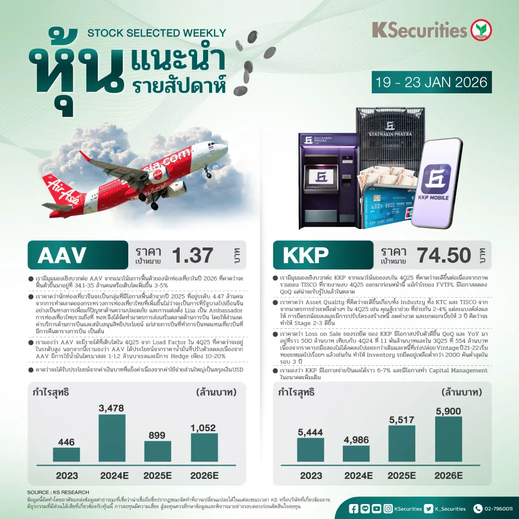 - เรามีมุมมองเชิงบวกต่อ AAV จากแนวโน้มการฟื้นตัวของนักท่องเที่ยวในปี 2026 ที่คาดว่าจะฟื้นตัวขึ้นมาอยู่ที่ 34.1-35 ล้านคนหรือเติบโตเพิ่มขึ้น 3-5%