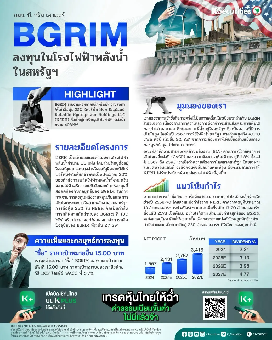 - BGRIM รายงานต่อตลาดหลักทรัพย์ฯ เมื่อวันที่ 12 ม.ค. ว่าบริษัทฯ ได้เข้าซื้อหุ้น 25% ในบริษัท New England Reliable Hydropower Holdings LLC (NERH) ซึ่งเป็นผู้ดำเนินธุรกิจโรงไฟฟ้าพลังน้ำขนาด 406MW