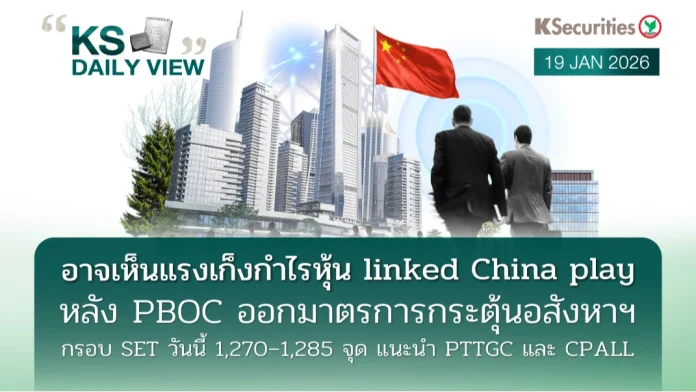 KS Daily View 19.01.2026 >>> อาจเห็นแรงเก็งกำไรหุ้น linked China play หลัง PBOC ออกมาตรการกระตุ้นอสังหาฯ กรอบ SET วันนี้ 1,270–1,285 จุด แนะนำ PTTGC และ CPALL
