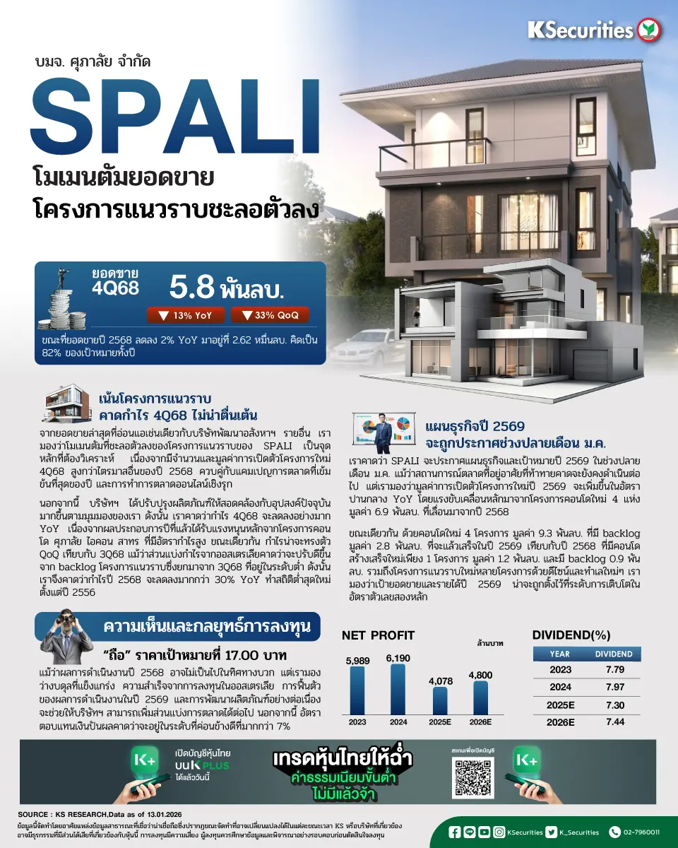 - ยอดขายไตรมาส 4/2568 ลดลงทั้ง YoY และ QoQ SPALI รายงานยอดขายไตรมาส 4/2568 ที่ 5.8 พันลบ. ลดลง 13% YoY และ 33% QoQ แม้ว่ามูลค่าการเปิดตัวโครงการใหม่ไตรมาส 4/2568 จะสูงที่สุดของปี 2568 และโครงการคอนโดใหม่อย่าง ศุภาลัย พรีเมียร์ ตากสิน-วงเวียนใหญ่ มูลค่า 2.6 พันลบ. จะได้รับการตอบรับที่ดีจากผู้ซื้อ ด้วยยอดขายมากกว่า 53% เรามองว่ายอดขายที่อ่อนแอนี้เกิดจากสภาพแวดล้อมตลาดที่อยู่อาศัยที่ซบเซาในไตรมาสดังกล่าว โดยเฉพาะในพื้นที่กรุงเทพฯและปริมณฑล อีกทั้งการตัดสินใจเลื่อนเปิดตัวคอนโดโครงการสำคัญอย่าง ศุภาลัย ลอฟท์ ท่าพระ อินเตอร์เชนจ์ มูลค่า 3.0 พันลบ. จากไตรมาส 4/2568 ไปเป็นไตรมาส 1/2569 ยิ่งส่งผลกระทบเชิงลบต่อยอดขายรวมของไตรมาส 4/2568 ส่งผลให้ยอดขายปี 2568 ลดลง 2% YoY เป็น 2.62 หมื่นลบ. คิดเป็น 82% ของเป้ายอดขายปี 2568 ที่ 3.2 หมื่นลบ. ทั้งนี้ มูลค่าการเปิดตัวโครงการใหม่ปี 2568 ลดลง 44% YoY เป็น 2.95 หมื่นลบ. จากแผนเมื่อต้นปีที่ 4.6 หมื่นลบ.