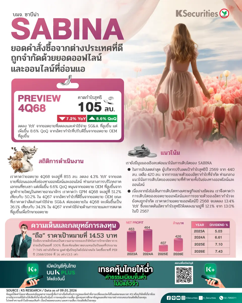 - พรีวิวไตรมาส 4/2568 SABINA มีกำหนดรายงานงบการเงินปี 2568 ในวันที่ 19 ก.พ. เราคาดว่าบริษัทฯ จะรายงานกำไรสุทธิไตรมาส 4/2568 ที่ 105 ลบ. ลดลง 7.2% YoY จากยอดขายที่ลดลงและค่าใช้จ่าย SG&A ที่สูงขึ้น แต่เพิ่มขึ้น 8.6% QoQ จากอัตรากำไรที่ปรับดีขึ้นจากยอดขาย OEM ที่สูงขึ้น พรีวิวกำไรสุทธิช่วง 12 เดือนของปี 2568 คิดเป็น 99.5% ของประมาณการกำไรสุทธิทั้งปี 2568 ของเรา และสะท้อนกำไรสุทธิปี 2568 ที่ 405 ลบ. ลดลง 12.7% YoY เราคาดว่า SABINA จะประกาศ DPS ครึ่งหลังปี 2568 ที่ 0.58 บาท ซึ่งสะท้อนอัตราการจ่ายเงินปันผลที่ 100% และอัตราตอบแทนเงินปันผลต่อปีที่ 7.1%