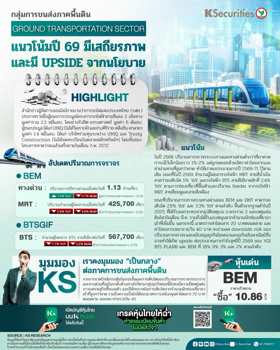 กลุ่มการขนส่งภาคพื้นดิน แนวโน้มปี 69 มีเสถียรภาพ และมี upside จากนโยบาย