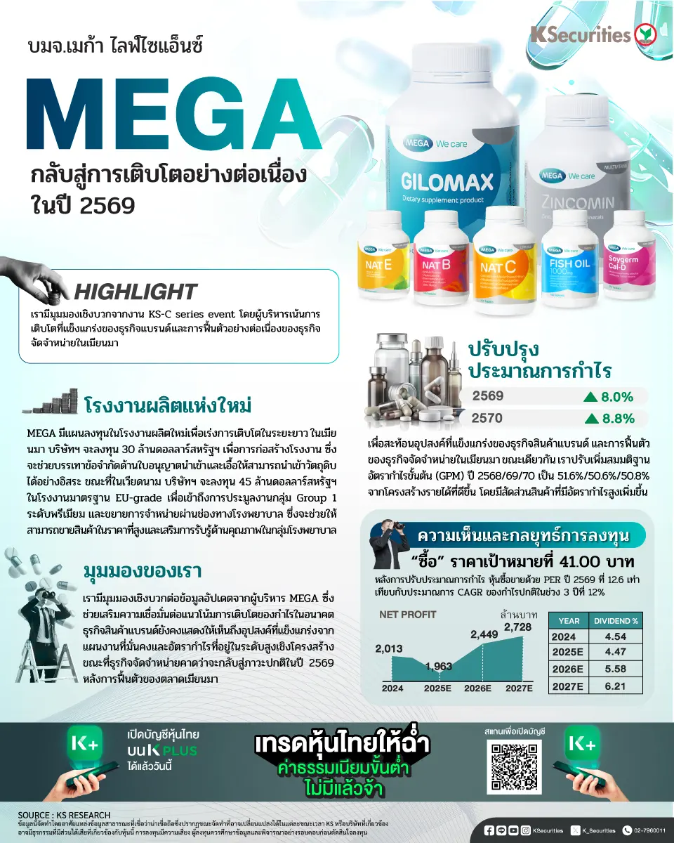 - ประเด็นสำคัญ เมื่อวันที่ 13 ม.ค. 2569 เราจัดงาน KS-C series event โดยมีผู้บริหารของ MEGA เข้าร่วมเป็นวิทยากร เพื่อหารือแนวโน้มธุรกิจของบริษัทฯ ในปี 2569 ประเด็นสำคัญ ได้แก่ 1) ธุรกิจสินค้าแบรนด์ยังคงแข็งแกร่ง โดยผู้บริหารคาดว่ารายได้จะเติบโตในระดับเลขหลักเดียวระดับสูงในปี 2569 2) ธุรกิจจัดจำหน่ายมีแนวโน้มการฟื้นตัวต่อเนื่อง หลังจากการผ่อนคลายใบอนุญาตนำเข้ายาตั้งแต่ไตรมาส 3/2568 ซึ่งคาดว่าจะดำเนินต่อเนื่องและกลับสู่ภาวะปกติในปี 2569 ด้วยการเติบโตของรายได้ระดับเลขหลักเดียวปานกลาง และ 3) ผู้บริหารตั้งเป้าเพิ่มกำไรเป็นสองเท่าภายในปี 2573 จากฐานปี 2568 โดยได้รับแรงหนุนจากการขยายยอดขายในอินโดนีเซียผ่านการเจาะตลาดผลิตภัณฑ์เสริมอาหาร รวมถึงโรงงานใหม่ในเมียนมาและเวียดนาม ซึ่งคาดว่าจะดำเนินการเชิงพาณิชย์เต็มรูปแบบในปี 2572