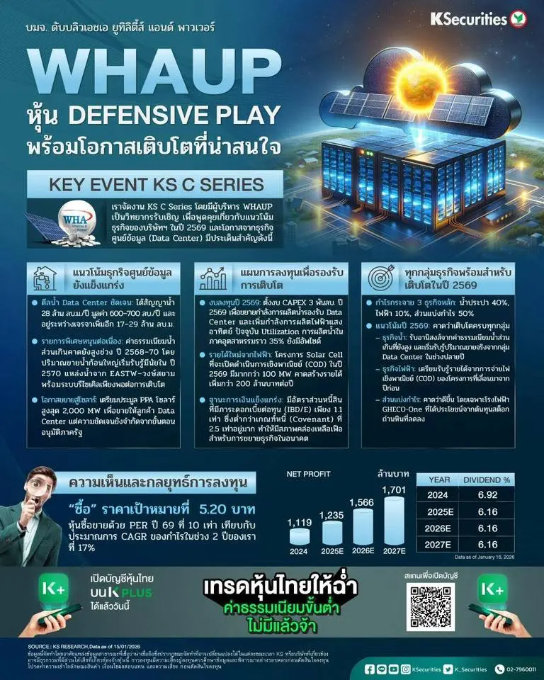 - แนะ “ซื้อ”และราคาเป้าหมายสิ้นปี 2569 เดิมที่ 5.20 บาท เรายังคงมุมมองที่เป็นบวกหลังจากงาน KS C-series เนื่องจาก WHAUP ได้รับประโยชน์จากกระแสการลงทุนในธุรกิจศูนย์ข้อมูลผ่านธุรกิจน้ำประปาอยู่แล้ว และยังมี upside เพิ่มเติมจากความต้องการใช้ไฟฟ้าที่เพิ่มขึ้น