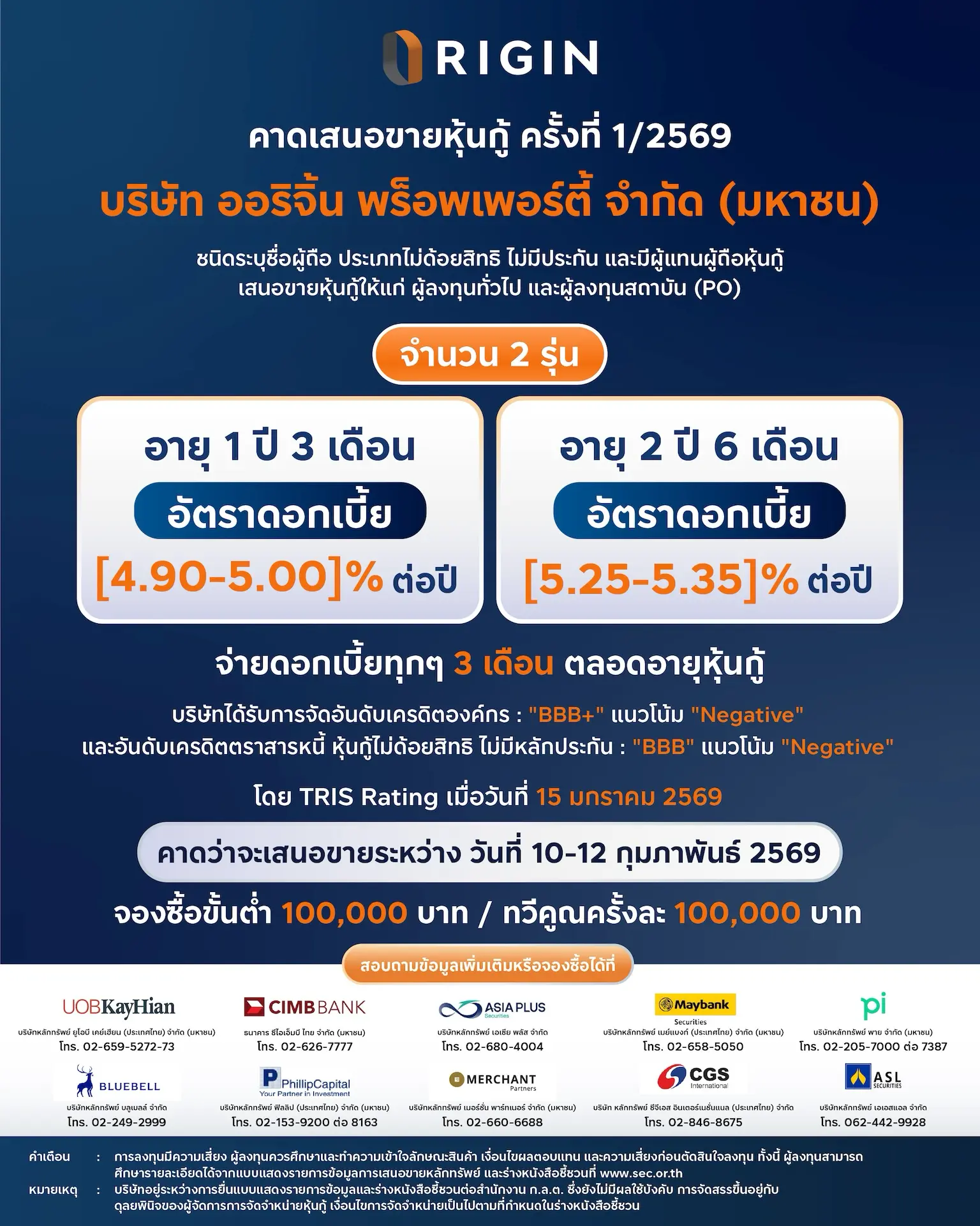 ออริจิ้น พร็อพเพอร์ตี้ คาดว่าจะเสนอขายหุ้นกู้ครั้งที่ 1/2569 จำนวน 2 ชุด อายุ 1 ปี 3 เดือน และ 2 ปี 6 เดือน