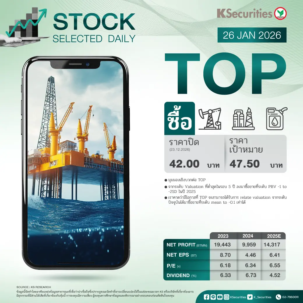 - มุมมองเชิงบวกต่อ TOP จากระดับ Valuation ที่ต่ำสุดในรอบ 5 ปี ลงมาซื้อขายที่ระดับ PBV -1 to -2SD ในปี 2025