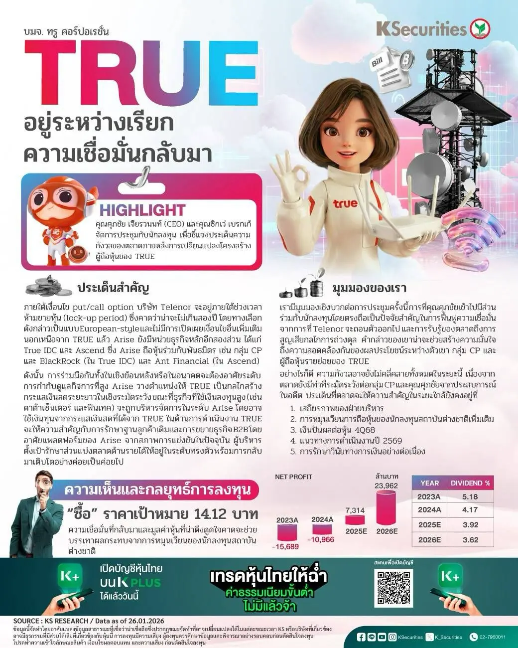 TRUE อยู่ระหว่างฟื้นความเชื่อมั่น หลังความกังวลเรื่องกลไกถ่วงดุลจากการถอนตัวของ Telenor อย่างไรก็ดี ตลาดยังคงจับตา 1) เสถียรภาพทีมผู้บริหาร 2) DPS งวด 4Q25 3) guidance ปี 2026 และ 4) วินัยทางการเงินอย่างต่อเนื่อง
