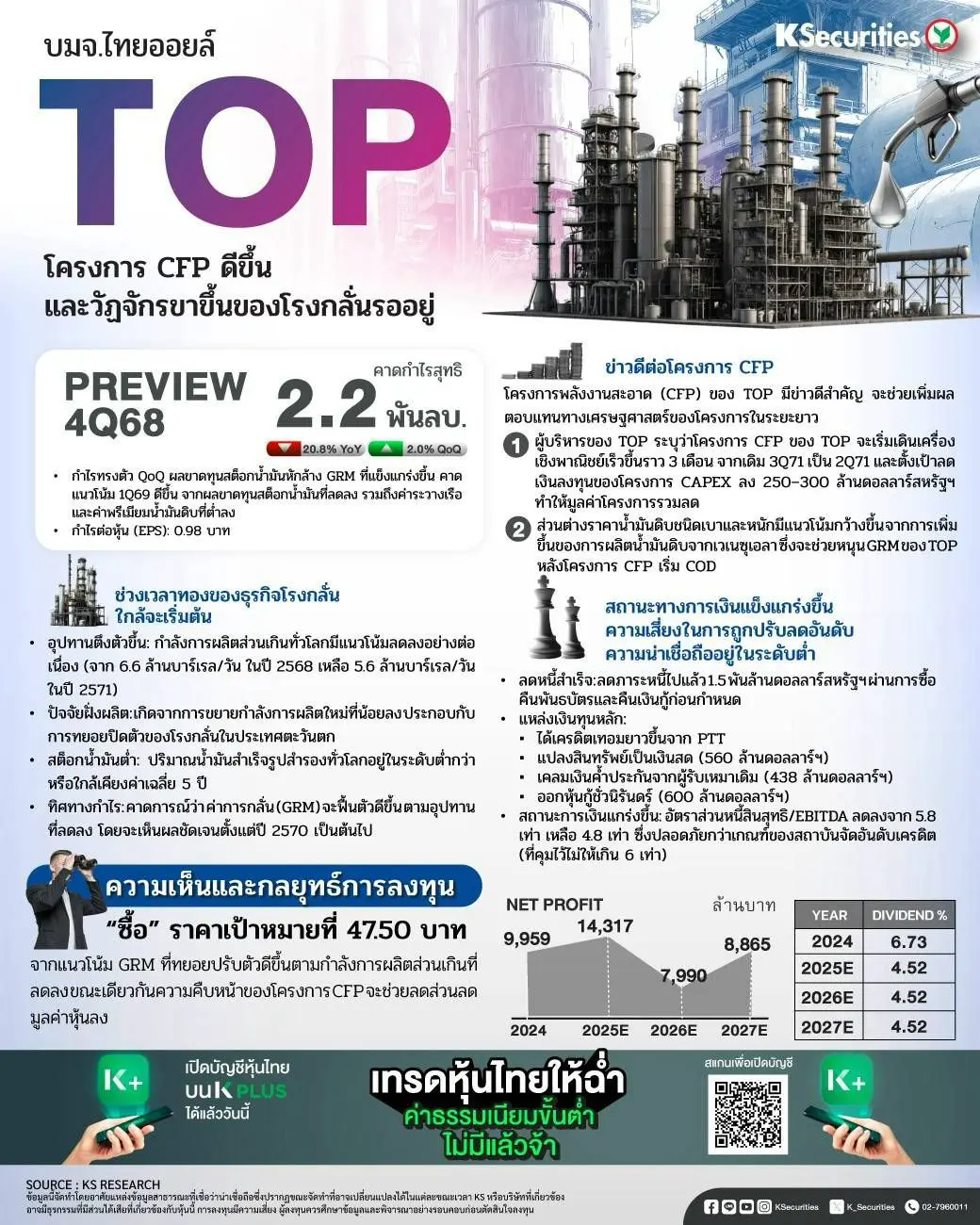 หุ้น TOP โครงการ CFP ดีขึ้น และวัฏจักรขาขึ้นของโรงกลั่นรออยู่ เราคาดกำไร 4Q68 ที่ 2.2 พันลบ. ทรงตัว QoQ