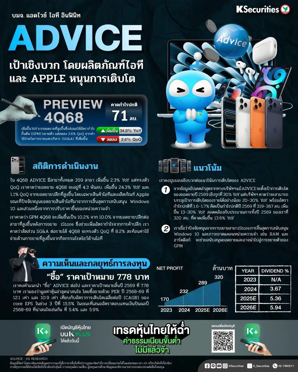 เราคงมุมมองเชิงบวกต่อแนวโน้มการเติบโตของ ADVICE ประการแรก จากข้อมูลอัปเดตล่าสุดจากทางบริษัทฯ แม้ ADVICE จะตั้งเป้าการเติบโตของยอดขายปี 2569 เชิงรุกที่ 30% YoY แต่บริษัทฯ คาดว่าจะสามารถบรรลุเป้าการเติบโตของรายได้อย่างน้อย 20–30% YoY พร้อมอัตรากำไรปกติที่ 1.6–1.7% คิดเป็นกำไรปกติปี 2569 ที่ 319–367 ลบ. เพิ่มขึ้น 13–30% YoY สอดคล้องกับประมาณการทั้งปี 2569 ของเราที่ 320 ลบ. ที่คาดเพิ่มขึ้น 13.6% YoY ประการที่สอง เราเชื่อว่าปัจจัยหนุนจากการขยายสาขา iStore การสิ้นสุดการสนับสนุน Windows 10 และภาวะขาดแคลนหน่วยความจำ เช่น RAM และฮาร์ดดิสก์ จะช่วยสนับสนุนยอดขายและอาจนำไปสู่การขยายตัวของ GPM