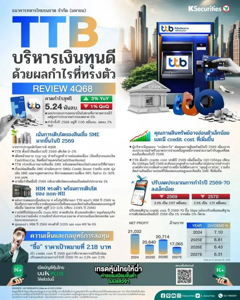 TTB กำไร 4Q68 ที่ 5.24 พันลบ. ปรับดีขึ้น YoY 3% YoY และมีแผนกลับมาขยายการปล่อยสินเชื่อที่ 0-2% ในปี 69 TTB น่าสนใจเนื่องจากความมุ่งมั่นในการบริหารจัดการเงินทุนในระยะยาว จากโครงการซื้อหุ้นคืนในปี 69-70 พร้อมอัตราตอบแทนเงินปันผลที่คาดว่าจะสูงถึง 6.4% ในปี 69