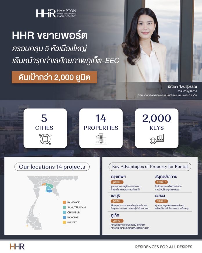 นางสาวปีณิตา ศิลปสุวรรณ กรรมการผู้จัดการ บริษัท แฮมป์ตัน โฮเทล แอนด์ เรสซิเดนซ์ แมเนจเม้นท์ จำกัด หรือ HHR กลุ่มธุรกิจบริหารจัดการอสังหาริมทรัพย์กลุ่มงาน Living Service ในเครือบริษัท พรีโม เซอร์วิส โซลูชั่น จำกัด (มหาชน) หรือ PRI เปิดเผยว่า HHR เป็นกลุ่มธุรกิจกลางน้ำ (Living Services) ที่ให้บริการที่เกี่ยวกับการอยู่อาศัยและการใช้ชีวิตหลังจากโครงการแล้วเสร็จ โดยเฉพาะการให้บริหารจัดการ Residential Property และ Service Apartment ปัจจุบัน HHR ได้ขยายพอร์ตโฟลิโอเดิมที่รับบริหารอยู่ 10 โครงการ เพิ่มเป็น 14 โครงการในไตรมาส1/2569 นี้ ทำให้มีจำนวนห้องพักรวมกว่า 2,000 ยูนิต ครอบคลุม 5 เมืองใหญ่ในพื้นที่เศรษฐกิจและการท่องเที่ยวเที่ยวทั้งในกรุงเทพฯ,สมุทรปราการ, ชลบุรี, ระยอง และภูเก็ต