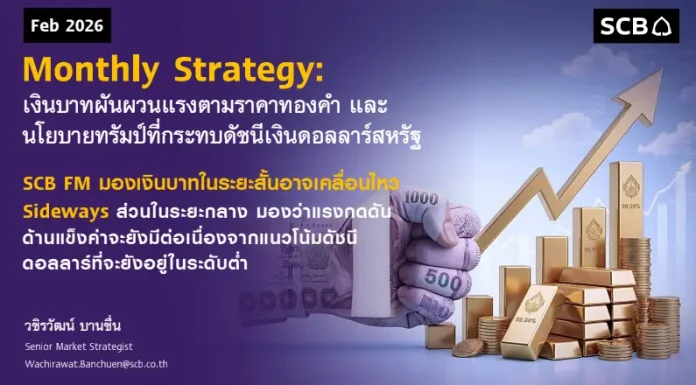 นายแพททริก ปูเลีย รองผู้จัดการใหญ่ Head of Financial Markets Function ธนาคารไทยพาณิชย์ จำกัด (มหาชน) เปิดเผยว่าในเดือนที่ผ่านมาเงินบาทผันผวนสูงจากปัจจัยต่างประเทศเป็นหลัก โดยในเดือนมกราคม เงินบาทแข็งค่าเร็วแตะระดับ 30.85 บาทต่อดอลลาร์ ซึ่งหลัก ๆ เป็นผลจาก 1) ราคาทองคำที่สูงขึ้นทำ new-high หลายครั้ง หนุนให้บาทแข็งค่า 2) ประธานาธิบดีทรัมป์ส่งสัญญาณสนับสนุนดอลลาร์อ่อน ทำให้นักลงทุนเทขายดอลลาร์ออกมา 3) ตลาดโลก Risk‑on หลังสงครามการค้าระหว่างสหรัฐฯ–ยุโรป เบาลง และข้อพิพาทในประเด็นเรื่องถือครอง Greenland ได้ข้อยุติ ทำให้ความเชื่อมั่นนักลงทุนปรับดีขึ้น และมีเงินทุนไหลเข้าสินทรัพย์เสี่ยงใน EM-Asia อย่างไรก็ดี ในช่วงต้นเดือนกุมภาพันธ์นี้ เงินบาทกลับมาอ่อนค่าแรง หลังราคาทองคำลดลงแรงที่สุดในรอบกว่า 10 ปี อีกทั้ง ก่อนหน้านี้ผู้ว่า ธปท. กล่าวว่าพร้อมสนับสนุนบาทอ่อน และเข้าดูแลค่าเงินเพื่อชะลอการแข็งค่า รวมถึงออกมาตรการจำกัดการซื้อขายทองคำออนไลน์ (วงเงิน 50 ล้านบาทต่อวัน) ทำให้บาทกลับมาอ่อนค่า
