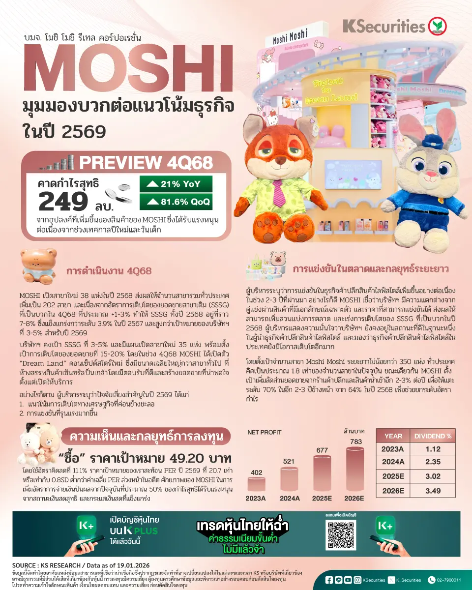 - MOSHI เปิดสาขาใหม่ 38 แห่งในปี 2568 ส่งผลให้จำนวนสาขารวมทั่วประเทศเพิ่มเป็น 202 สาขา และเนื่องจากอัตราการเติบโตของยอดขายสาขาเดิม (SSSG) ที่เป็นบวกในไตรมาส 4/2568 ที่ประมาณ +1-3% ทำให้ SSSG ทั้งปี 2568 อยู่ที่ราว 7-8% ซึ่งแข็งแกร่งกว่าระดับ 3.9% ในปี 2567 และสูงกว่าเป้าหมายของบริษัทฯ ที่ 3-5% สำหรับปี 2569 บริษัทฯ คงเป้า SSSG ที่ 3-5% และมีแผนเปิดสาขาใหม่ 35 แห่ง พร้อมตั้งเป้าการเติบโตของยอดขายที่ 15-20% โดยในช่วงไตรมาส 4/2568 MOSHI ได้เปิดตัว “Dream Land” คอนเซ็ปต์สโตร์ใหม่ ซึ่งมีขนาดเฉลี่ยใหญ่กว่าสาขาทั่วไป ที่ห้างสรรพสินค้าเซ็นทรัล ปิ่นเกล้า โดยมีตอบรับที่ดีและสร้างยอดขายที่น่าพอใจตั้งแต่เปิดให้บริการ อย่างไรก็ตาม ผู้บริหารระบุว่าปัจจัยเสี่ยงสำคัญในปี 2569 ได้แก่ 1) แนวโน้มการเติบโตทางเศรษฐกิจที่ค่อนข้างชะลอ และ 2) การแข่งขันที่รุนแรงมากขึ้น