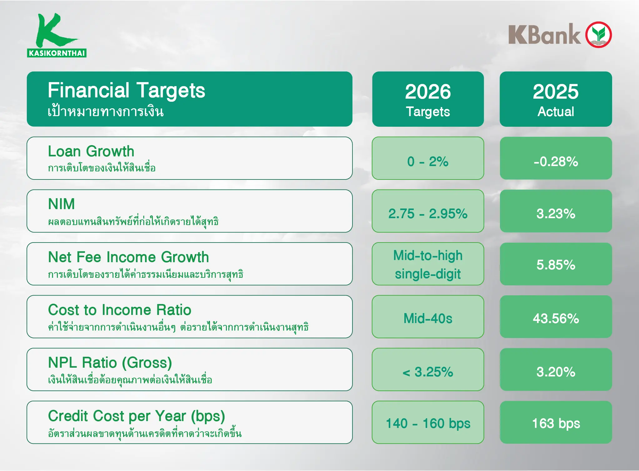 • อัตราส่วนผลขาดทุนด้านเครดิตที่คาดว่าจะเกิดขึ้น (Credit Cost): อยู่ที่ในช่วง 140-160 bps (Normalized Level) โดยธนาคารยังคงบริหารความเสี่ยงที่รอบคอบและระมัดระวังสอดคล้องกับสภาวะเศรษฐกิจ