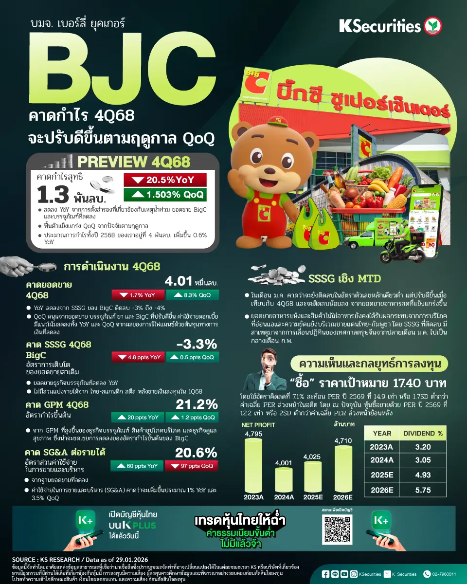 เราคาดว่า BJC จะรายงานกำไรสุทธิไตรมาส 4/2568 ที่ 1.3 ลบ. ลดลง 21% YoY แต่เพิ่มขึ้น 105% QoQ สำหรับเหตุอุทกภัยที่ อ.หาดใหญ่ จ.สงขลา เราตั้งสมมติฐานว่า BJC จะบันทึกค่าตั้งสำรองเผื่อความเสียหายของทรัพย์สินและสต๊อกสินค้าในไตรมาส 4/2568 ดังนั้น เราคาดว่ากำไรปกติจะลดลง 10% YoY แต่ปรับดีขึ้น 116% QoQ เป็น 1.36 พันลบ. กำไรที่ลดลงเชิง YoY น่าจะมาจาก 1) ยอดขายเชิง YoY ที่ลดลงทั้งในกลุ่มบรรจุภัณฑ์และกลุ่ม BigC 2) การหดตัวของอัตรากำไรขั้นต้น (GPM) ของ BigC YoY และ 3) รายได้ค่าเช่าที่ลดลงจากการเปลี่ยนสัดส่วนผู้เช่าและผลกระทบจากเหตุน้ำท่วม ส่วนกำไรที่ปรับดีขึ้นเชิง QoQ น่าจะมาจากปัจจัยตามฤดูกาลที่เอื้อต่อยอดขายของ BigC การปรับดีขึ้นของอัตรากำไรทุกกลุ่มธุรกิจ และค่าใช้จ่ายดอกเบี้ยที่ลดลง โดยประมาณการกำไรทั้งปี 2568 ของเราอยู่ที่ 4 พันลบ. เพิ่มขึ้น 0.6% YoY