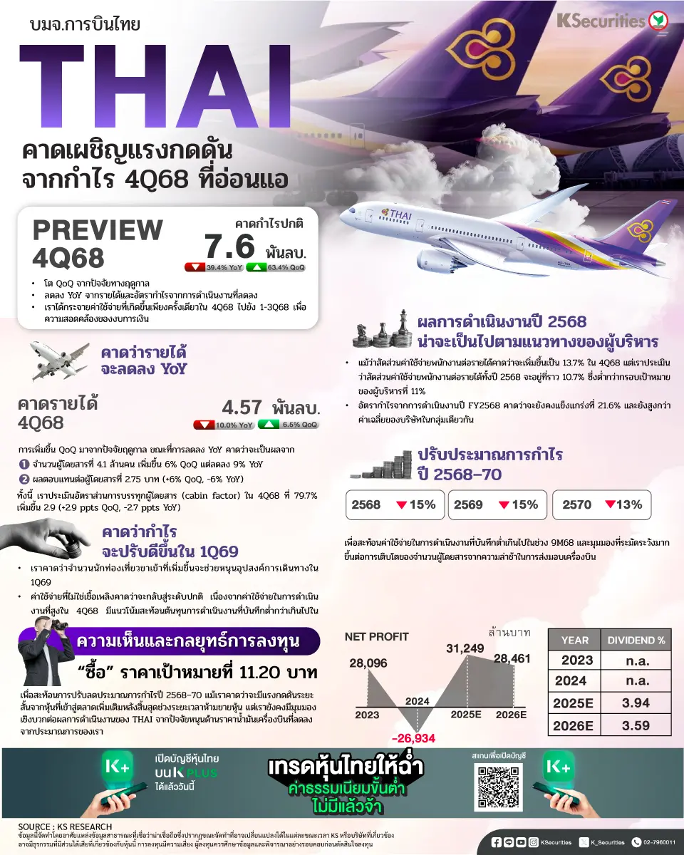 THAI คาดเผชิญแรงกดดันจากกำไรไตรมาส 4/68 ที่อ่อนแอ