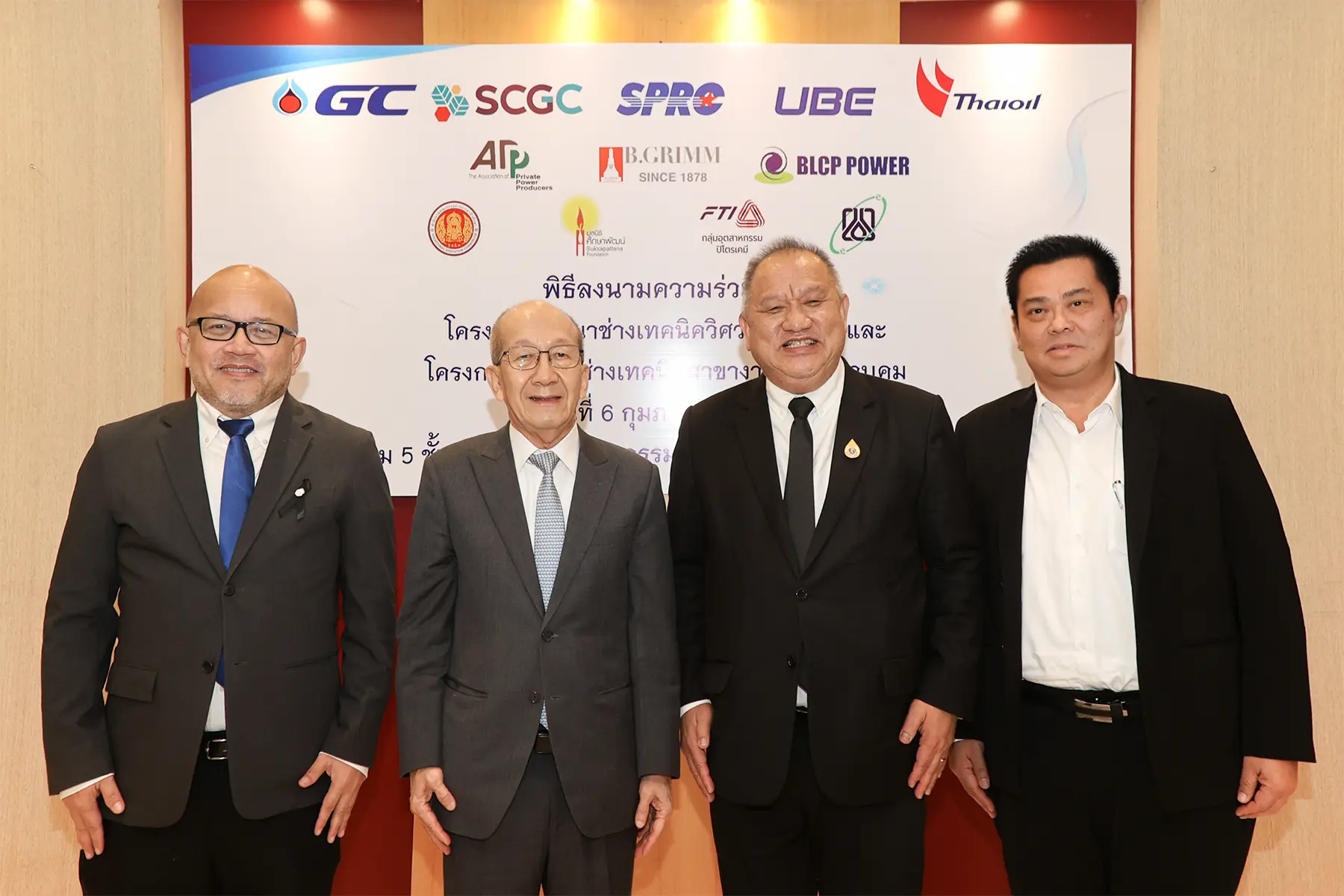 นายยุทธนา เจริญวงศ์ กรรมการผู้จัดการ (คนแรกซ้าย) และ นายอดิศร วังมูล ผู้อำนวยการสายงานการเงินและบริหารองค์กร (คนแรกขวา) บริษัท บีแอลซีพี เพาเวอร์ จำกัด (BLCP) พร้อมด้วย นายยศพล เวณุโกเศศ เลขาธิการคณะกรรมการการอาชีวศึกษา (ที่สองจากขวา) และ ดร.ศิริ จิระพงษ์พันธ์ ที่ปรึกษาโครงการพัฒนาช่างเทคนิควิศวกรรมเคมี และ ที่ปรึกษาคณะกรรมการบริหารโครงการพัฒนาช่างเทคนิควิศวกรรมเคมี อดีตรัฐมนตรีว่าการกระทรวงพลังงาน (ที่สองจากซ้าย) ร่วมลงนามความร่วมมือโครงการพัฒนาช่างเทคนิควิศวกรรมเคมี ระยะที่ 7 และ โครงการพัฒนาช่างเทคนิคสาขางานไฟฟ้าควบคุม ระยะที่ 4 พร้อมมอบเงินสนับสนุนโครงการฯ แก่ วิทยาลัยเทคนิคมาบตาพุด สถาบันการอาชีวศึกษาภาคตะวันออก เพื่อพัฒนาบุคลากรสายวิชาชีพอาชีวศึกษา สู่ภาคอุตสาหกรรม เมื่อเร็วๆ นี้