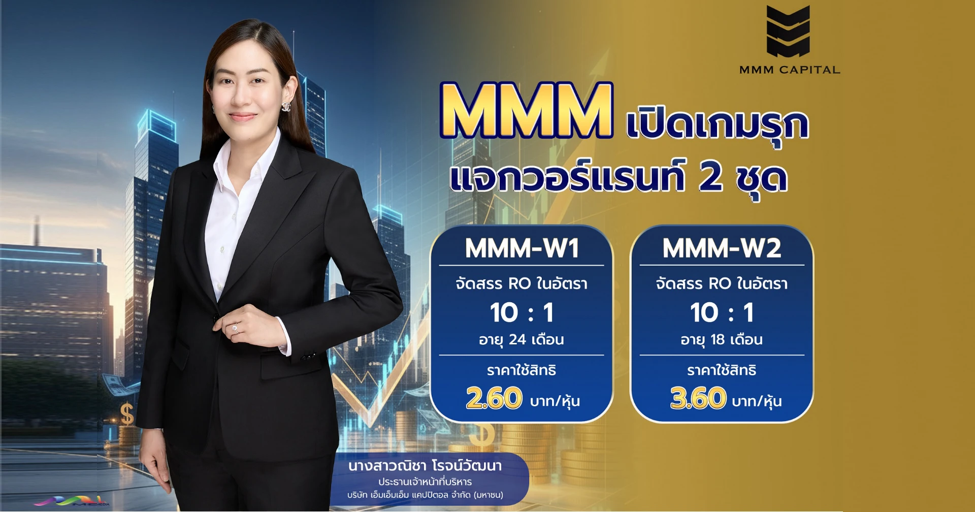 บมจ.เอ็มเอ็มเอ็ม แคปปิตอล หรือ MMM เดินหน้าต่อจิ๊กซอว์ทางธุรกิจ เปิดเกม รุกฆาต! หลังบอร์ดไฟเขียว แจกวอร์แรนท์ MMM-W1 และ MMM-W2 จำนวน 2 ชุดรวด 72.6 ล้านหน่วย ดึงนักลงทุนร่วมทัพ ขยายฐานทุนสู่การสยายปีกการลงทุนในอนาคต พร้อมระบุเงินที่ได้จากการแปลงสภาพวอร์แรนท์เพื่อขยายพอร์ตอสังหาฯ สู่การสร้าง Recurring Income
