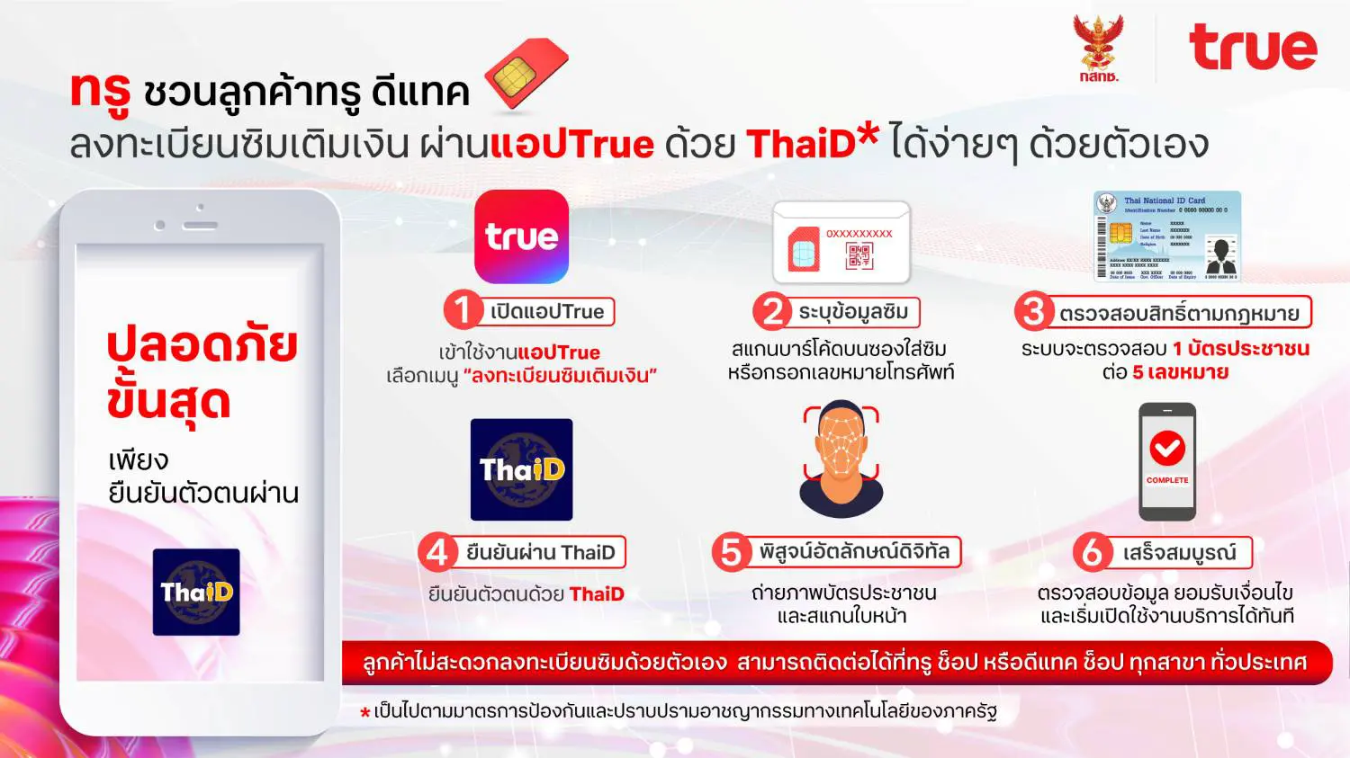 จากมาตรการป้องกันและปราบปรามอาชญากรรมทางเทคโนโลยี ของภาครัฐที่ร่วมบูรณาการพลังจากทุกภาคส่วน เพื่อยกระดับการป้องกันภัยคุกคามทางไซเบอร์ให้สามารถดำเนินการได้อย่างมีประสิทธิภาพ  ทรู คอร์ปอเรชั่น พร้อมขานรับและปฏิบัติตามนโยบายอย่างเคร่งครัด  เพื่อปกป้องสิทธิ์และคุ้มครองข้อมูลส่วนบุคคลสูงสุด โดยให้ตัวแทนจำหน่ายทั่วประเทศจะต้องมีการลงทะเบียนซิมด้วยเครื่องอ่านบัตรประชาชน (Smart Card Reader) และอำนวยความสะดวกให้ลูกค้าสามารถลงทะเบียนซิมเติมเงินได้ด้วยตัวเองง่ายๆ ทุกที่ ทุกเวลา  ผ่านแอปTrue ที่จะยืนยันตัวตนด้วย ThaiD ซึ่งจะช่วยเพิ่มความปลอดภัยในการใช้งาน เป็นเกราะป้องกันภัยจากมิจฉาชีพที่แข็งแกร่ง  พร้อมมอบประสบการณ์ดิจิทัลที่ใช้งานง่าย เชื่อถือได้ และมั่นใจได้เสมือนการติดต่อทำรายการด้วยตนเองที่ช็อป  ลูกค้าทรู ดีแทค เริ่มใช้งานได้แล้ววันนี้