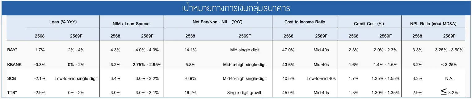 โดยฝ่ายวิจัยมองว่าเป้า NIM กรอบล่างที่ 2.75% ค่อนข้างอนุรักษ์นิยม (คิดเป็น NII ราว 1.21 แสนล้านบาท ลดลง 12% YoY VS ปี 2568 -7% YoY) พิจารณาจากระดับ NIM งวด 4Q68 ที่ 3.1% (1Q68 ที่ 3.4% ซึ่งตลอดปี 2568 มีการลดดอกเบี้ย 4 ครั้ง) หรือ NII ประมาณ 3.3 หมื่นล้านบาท คิดเป็นค่าเฉลี่ยต่อวัน (92 วัน) ที่ 358 ล้านบาท แปลงเป็นทั้งปี (365 วัน) จะอยู่ที่ 1.3 แสนล้านบาท ภายใต้โอกาสในการลดดอกเบี้ยนโยบายอีกเพียง 1 ครั้ง ไม่น่าจะกดดัน NII ให้ลงไปถึงตัวเลขตามข้างต้นได้ ตามความเห็นฝ่ายวิจัย