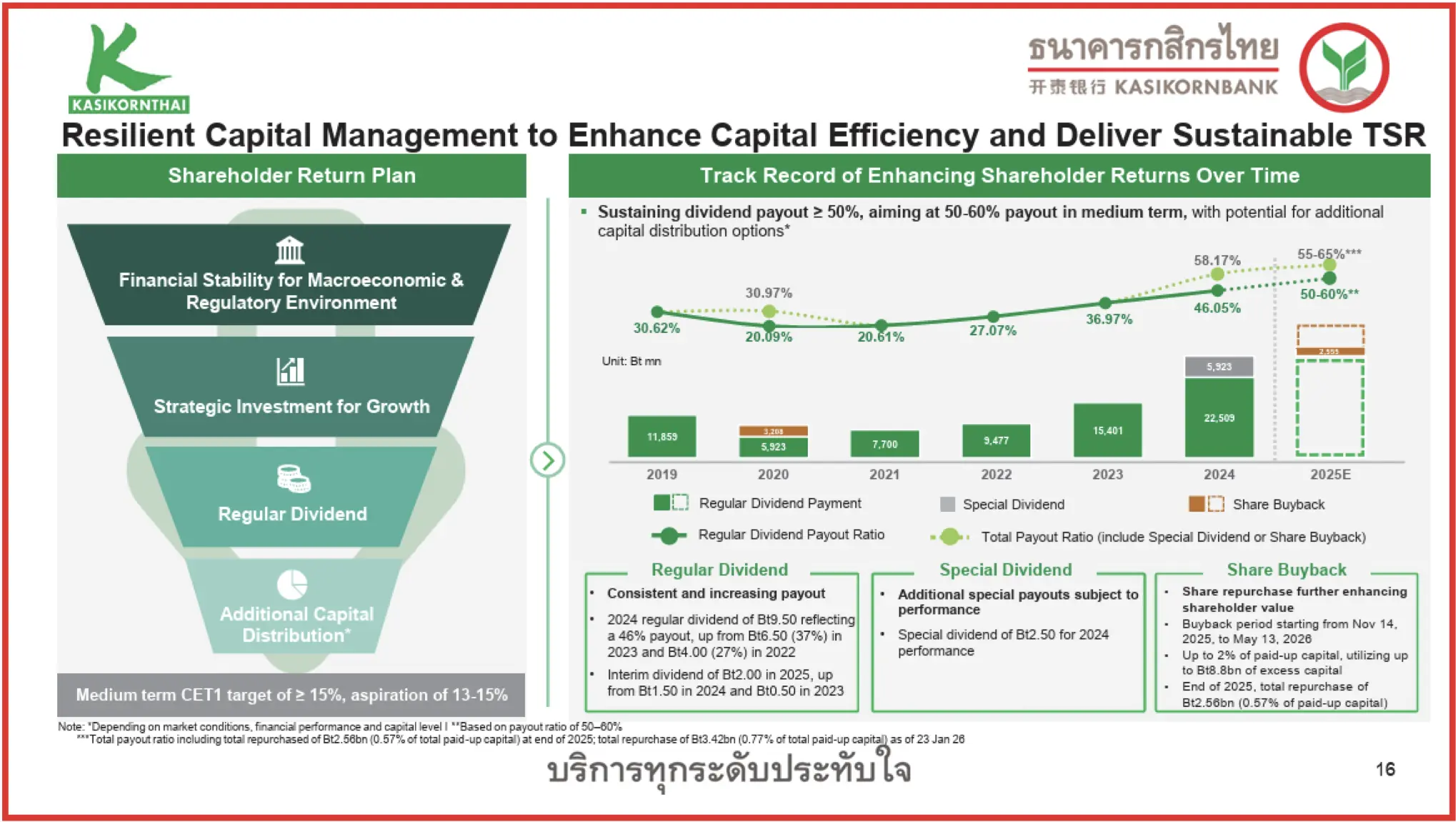 แม้การดำเนินงานปีนี้ถูกกดดันจากวงจรดอกเบี้ย แต่ทาง KBANK ตั้งเป้าหมายการสร้างผลตอบแทนให้ผู้ถือหุ้น (Total Shareholder Return : TSR) ภายใต้ระดับ CET-1 ราว 18% (เกณฑ์ขั้นต่ำ 8.0%) และ Tier-1 ที่ 18.4% (เกณฑ์ขั้นต่ำ 9.5%) พร้อมรองรับการบริหารโครงสร้างเงินทุนและการเติบโต (รวมถึงผลกระทบจาก Basel III reforms ในอนาคต ที่ 1% – 2%)